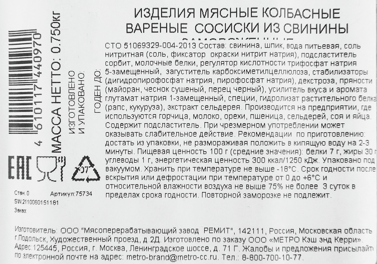 METRO Chef Сосиски из свинины вареные замороженные 17см, 750г