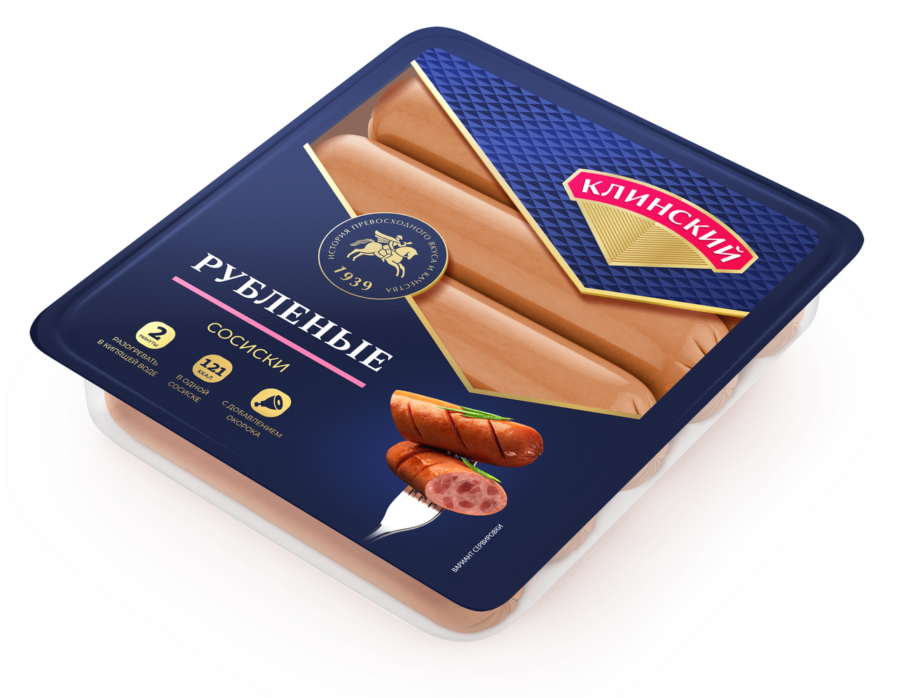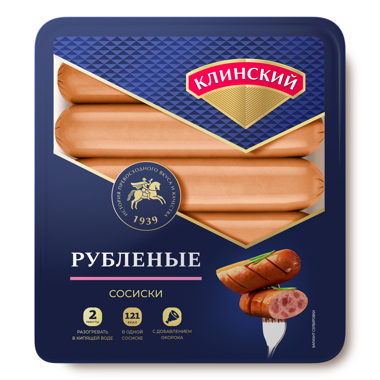Сосиски Рубленые - новинка в ассортименте бренда Клинский. Свинина, нежное куриное филе с добавлением кусочков окорока при разогреве придают продукту сверх сочность. Сосиски имеют не классический утолщенный диаметр. Изготовлены из свинины, куриного филе и говядины. Фарш плотный и сочный, с вкраплениями кусочков окорока. Сосиски обладают насыщенным мясным ароматом с оттенком копчения и легкими нотами кардамона и душистого перца.