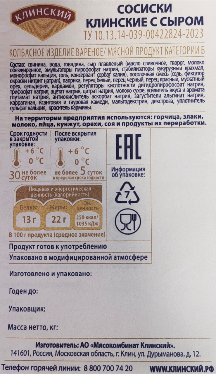 Сосиски Клинские с сыром приготовлены из отборной свинины и говядины с добавлением легких пряностей, соли, сахара и кусочков сыра твердых сортов.