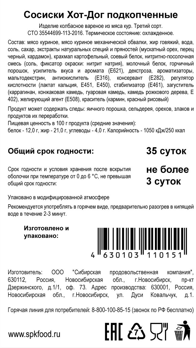 Мясо птицы, мясо птицы механической обвалки, жир свиной, жир говяжий, вода, соль, сахар, экстракты натуральных специй и пряностей (мускатный орех, перец черный, кардамон), крахмал картофельный, соевый белок, нитритно-посолочная смесь (соль, фиксатор окраски: нитрит натрия), молочный белок, горчичный порошок, усилитель вкуса и аромата (Е621), декстроза, ароматизаторы, мальтодекстрин, антиокислитель (Е316), консервант (Е282), регулятор кислотности (лактат кальция, Е451, Е450), стабилизатор (Е461), загуститель (каррагинан, конжаковая камедь, гуаровая камедь, камедь рожкового дерева, Е402), желирующий агент (Е508), краситель (кармин, красный рисовый). Продукт может содержать следы: яичного порошка, сельдерея, орехов, злаков и продуктов их переработки.