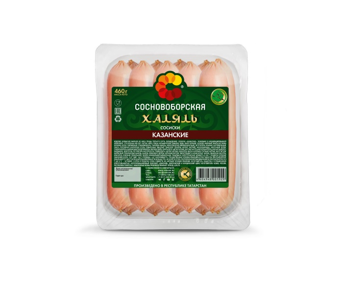 Сосиски Сосновоборская Казанские халяль с подкопчением, 460г изготовлены из мяса птицы с копчением на натуральной буковой щепе.