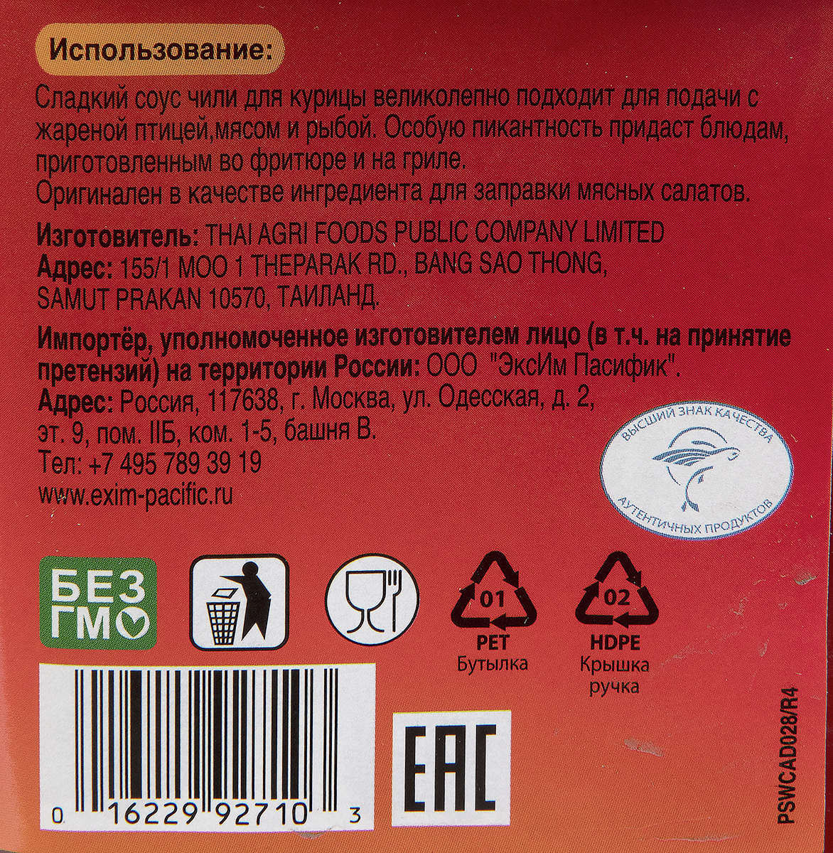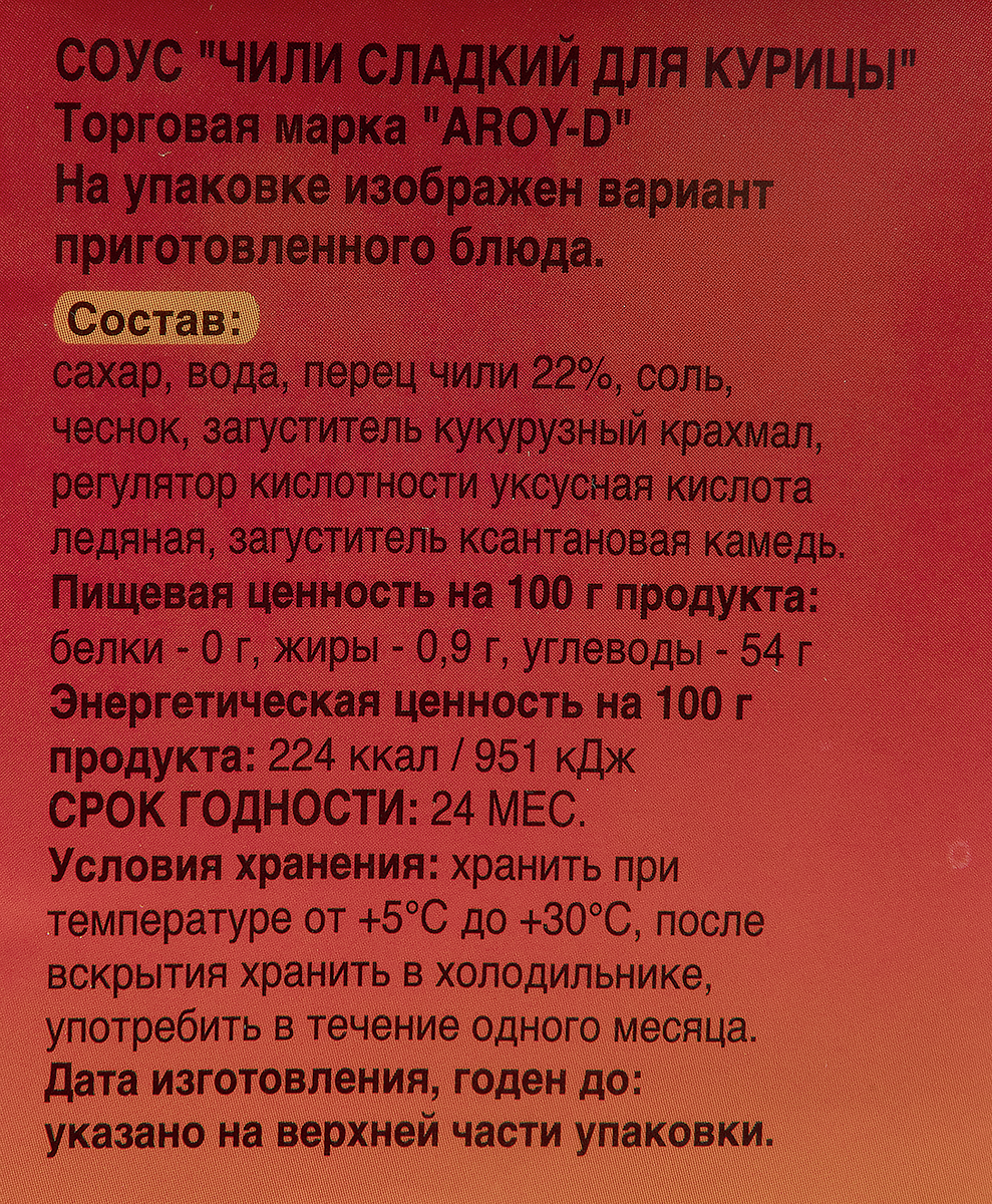 Сахар 40%, вода 30,18%, перец чили 22%, соль 4%, чеснок 2,5%, кукурузный крахмал, уксусная кислота, стабилизатор ксантановая камедь.