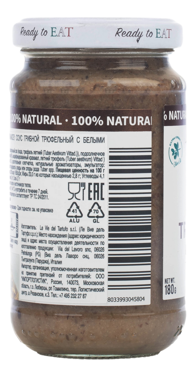 Грибы Шампиньоны (Agaricus bisporus) 40%, трюфельный сок (вода, трюфель летний (Tuber Aestivum Vittad)), подсолнечное масло, белые грибы (Boletus edulis и родственная группа) 5%, модифицированный крахмал, летний трюфель (Tuber aestivum) Vittad) 3%, оливковое масло первого холодного отжима 2%, растительная клетчатка, натуральные ароматизаторы, эмульгатор: подсолнечный лецитин, соль, петрушка, перец.