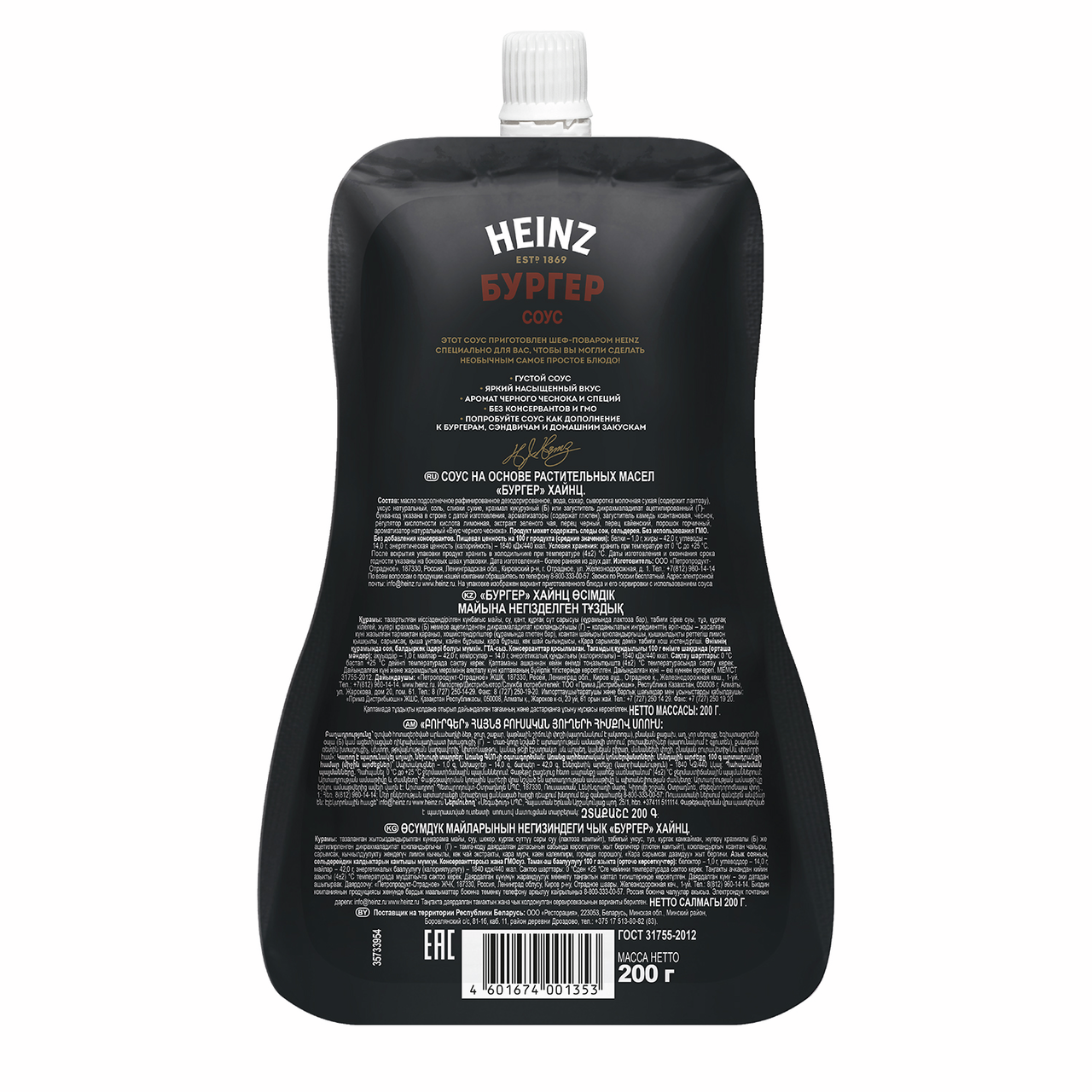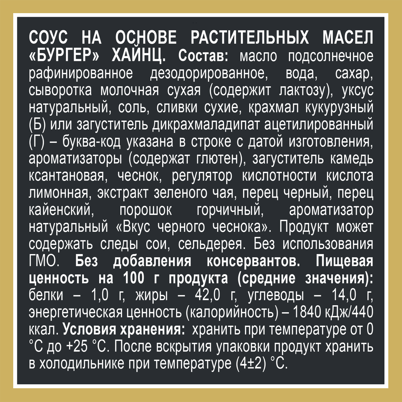 Соус Бургер от Heinz - пикантное дополнение к сэндвичам и бургерам. В составе этого превосходного бургерного соуса со вкусом черного чеснока - масла, сливки и яркая композиция из черного и кайенского перцев. Оцените неповторимый вкус соуса Бургер от шеф-поваров Heinz и превращайте ваши любимые блюда в необычные кулинарные шедевры. Смело сочетайте этот соус Heinz не только с бургерами, но и со стейком, блюдами из птицы, салатами и спагетти. Уникальная рецептура, высочайшее качество всех ингредиентов и оригинальный запоминающийся вкус - это особая черта всех соусов Heinz. Соусы упакованы в пакеты дой-пак с завинчивающимися крышками. Такую упаковку легко взять с собой и очень удобно хранить в холодильнике, так как дой-пак может располагаться вертикально и надежно сохранять продукт внутри.