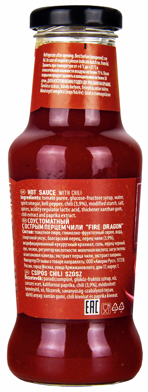 Томатная пюре, глюкозно-фруктозный сироп, вода, спиртовой уксус, болгарский перец, перец чили (3,9 %), модифицированный кукурузный крахмал, соль, перец черный, лук, чеснок, регулятор кислотности: молочная кислота; загуститель: ксантановая камедь; экстракт перца чили, экстракт паприки.