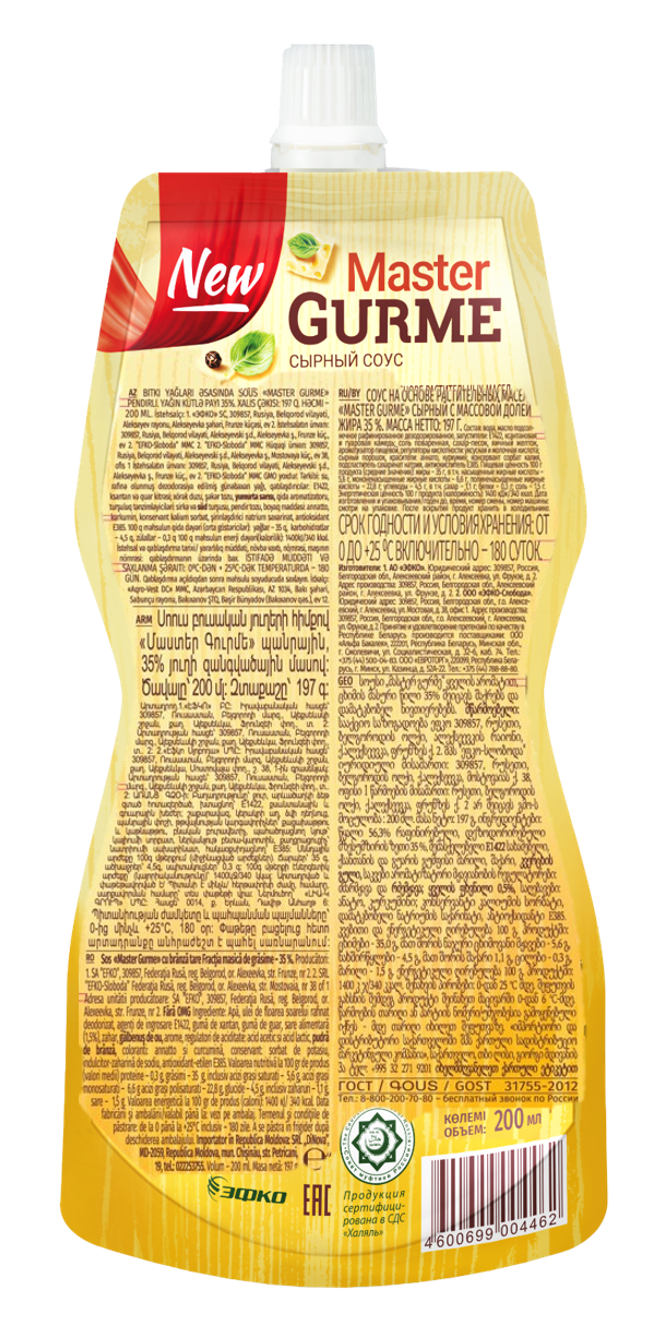Вода, масло подсолнечное рафинированное дезодорированное, загустители: Е1422, ксантановая и гуаровая камедь; сахар-песок, соль поваренная, яичный желток, сырный порошок, уксус, натуральный ароматизатор, консервант сорбат калия, краситель бета-каротин, подсластитель сахаринат натрия, антиокислитель Е385.
