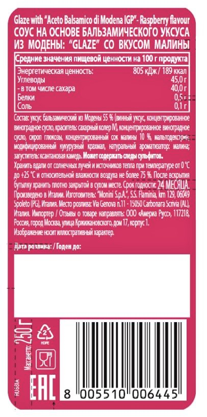 Уксус бальзамический из Модены 55 % (винный уксус, концентрированное виноградное сусло, краситель: сахарный колер IV), концентрированное виноградное сусло, сироп глюкозы, концентрированный сок малины 10 %, мальтодекстрин, модифицированный кукурузный крахмал, натуральный ароматизатор: малина; загуститель: ксантановая камедь.
