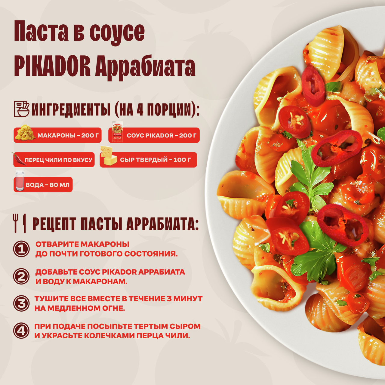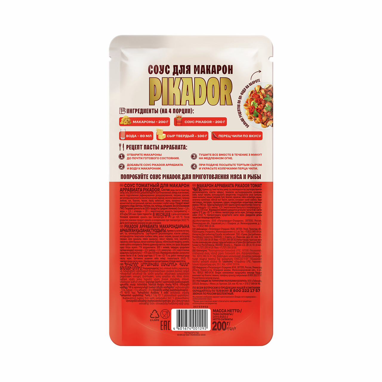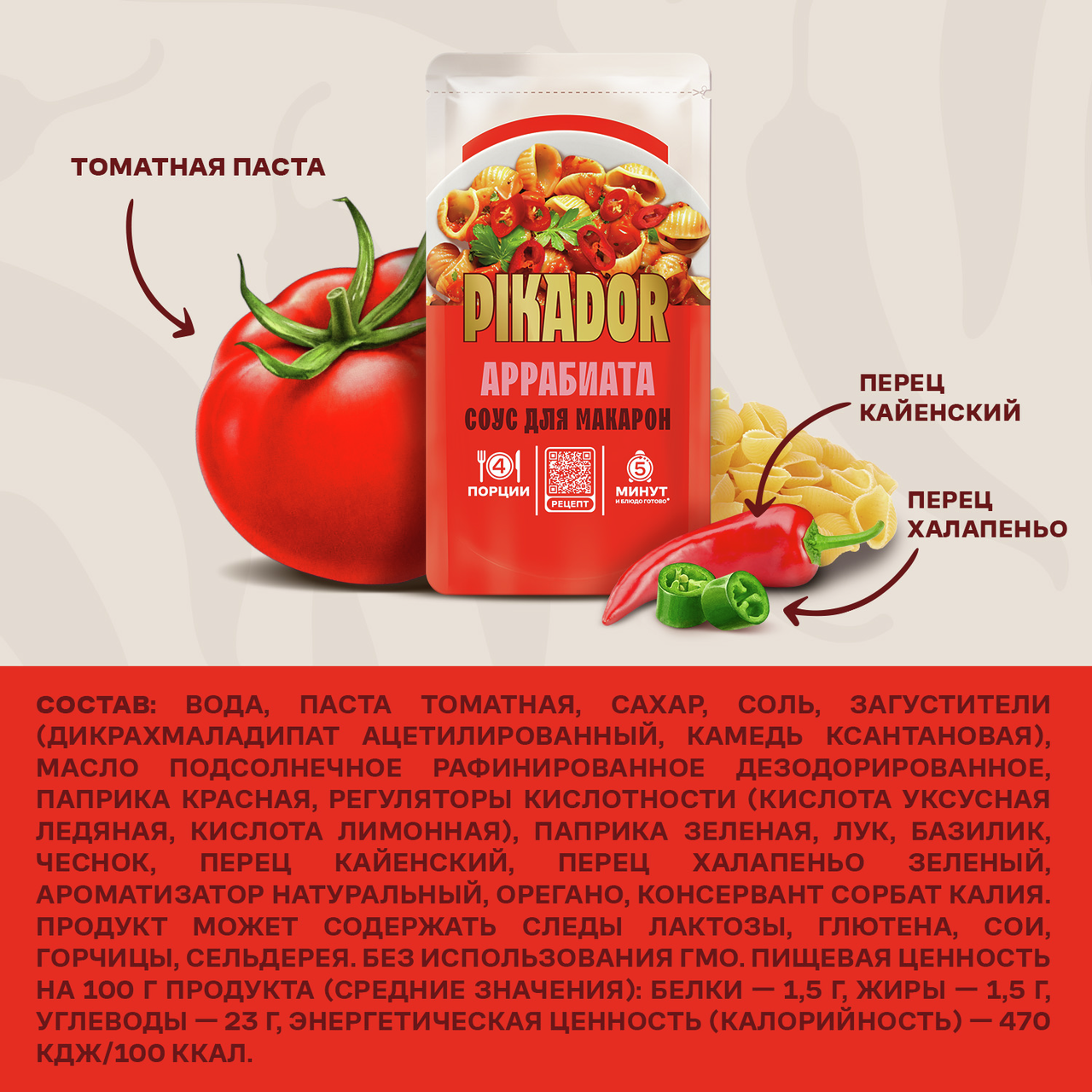 Погрузитесь в атмосферу итальянских вкусов с томатным соусом для макарон Аррабиата! Этот соус сочетает в себе отборные томаты, пикантную паприку, ароматный базилик и чеснок, создавая неповторимый вкус. Благодаря кайенскому перцу и халапеньо соус обладает умеренной остротой, которая даёт возможность вашим блюдам раскрыться по-новому. Рецепт пасты с соусом Аррабиата: 1. Отварите макароны до почти готового состояния. 2. Добавьте соус Аррабиата и воду к макаронам. 3. Тушите все вместе в течение 3 минут на медленном огне. 4. При подаче посыпьте тертым сыром и украсьте колечками перца чили. Соус для макарон представлен в удобной упаковке. Упаковка рассчитана на 4 порции, что позволяет использовать весь продукт за одно приготовление без необходимости хранить оставшийся соус в холодильнике. Производится на основе отборных томатов с добавлением паприки, базилика, чеснока и прочих ингредиентов. Также в его составе присутствуют халапеньо и кайенский перец - они придают соусу умеренную остроту. Продукт прекрасно сочетается со всеми видами макаронных изделий, а также с мясом и рыбой. Не содержит ГМО и красителей. Обратите внимание: рецепт вкуснейшей пасты представлен на обратной стороне упаковки.