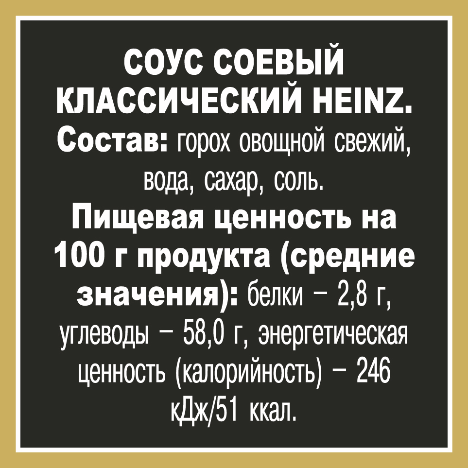 Соевый соус Heinz классический обладает традиционным сбалансированным вкусом, который характерен для главного соуса азиатской кухни. Соевый соус — это король в кулинарных традициях Японии, Китая и многих других дальневосточных стран. Неотъемлемые компоненты классического соевого соуса Heinz - натуральные ингредиенты, многолетний опыт экспертов и проверенные рецепты. Heinz изучает и творчески воплощает лучшие азиатские кулинарные традиции. Классический соевый соус Heinz — это именно то, что нужно для суши и роллов, риса и рыбы в азиатском стиле. Этот соус также отлично замаринует мясо или птицу для жарки в воке или послужит пикантной добавкой для готовых блюд.