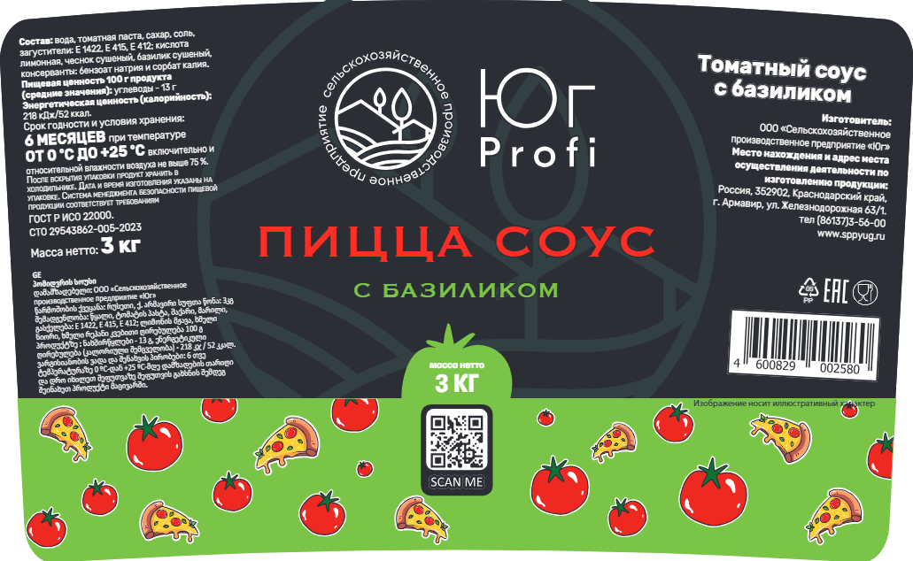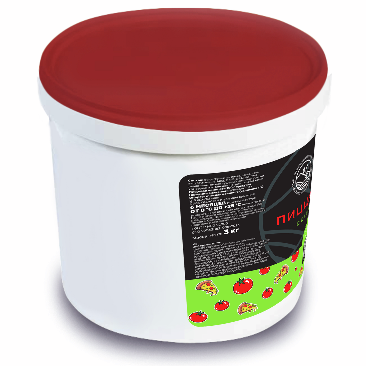Вода, томатная паста, сахар, соль, загустители: Е1422, Е415, Е412; кислота лимонная, чеснок сушеный, базилик сушеный, консерванты: бензоат натрия и сорбат калия.