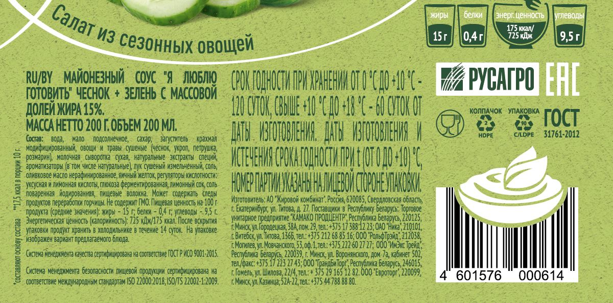Вода, масло подсолнечное, сахар, загуститель крахмал модифицированный, овощи и травы сушеные (чеснок, укроп, петрушка, розмарин), молочная сыворотка сухая, натуральные экстракты специй, ароматизаторы (в том числе натуральные), лук сушеный измельченный, соль, оливковое масло нерафинированное, яичный желток, регуляторы кислотности: уксусная и лимонная кислоты, глюкоза ферментированная, лимонный сок, соль поваренная йодированная, пищевые волокна.