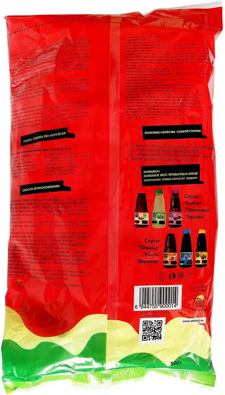 Cоевая спаржа производится на основе соевого молока, образующего при нагревании пенку, из которой и делается такая спаржа. Готовый продукт можно использовать для приготовления салатов, всевозможных супов и жарки с мясными изделиями, а также холодных закусок. Способ применения: замочите пачку лапши на ночь. Утром пожарьте в казане пару измельченных луковиц и три морковки вместе с несколькими ложками подсолнечного масла до полуготовности. После этого добавьте столовую ложку томатной пасты и порезанную по 4 см. хорошо выжатую спаржу, а также болгарские перцы (2). Прожарив в течение 7 минут, нужно сдобрить кушанье тертыми зубками чеснока (3-мя), а также приправами по вкусу. Накрыв крышкой, дайте потушиться спарже минут десять. При подаче к столу она поливается соевым соусом и украшается нарезанной зеленью.
