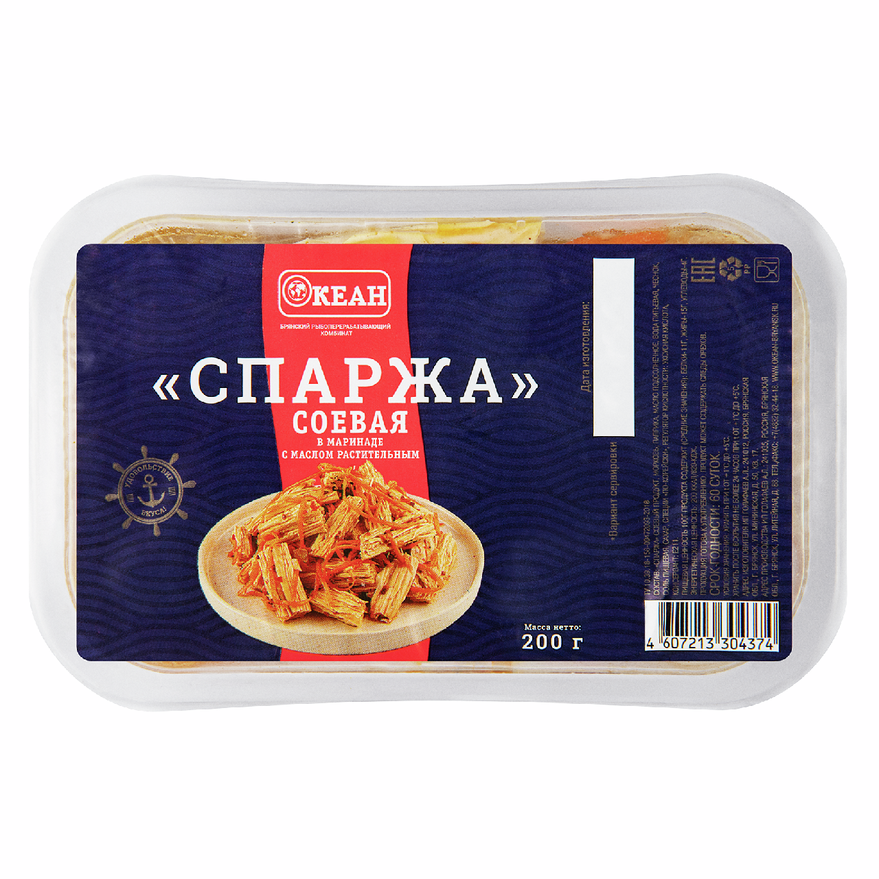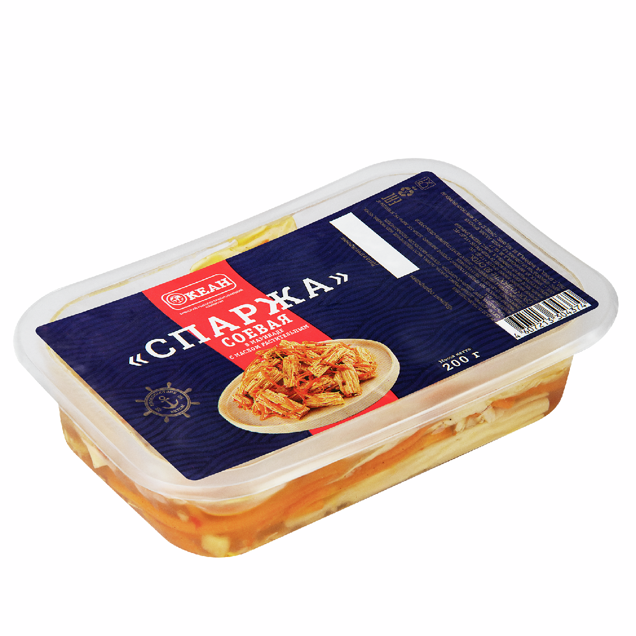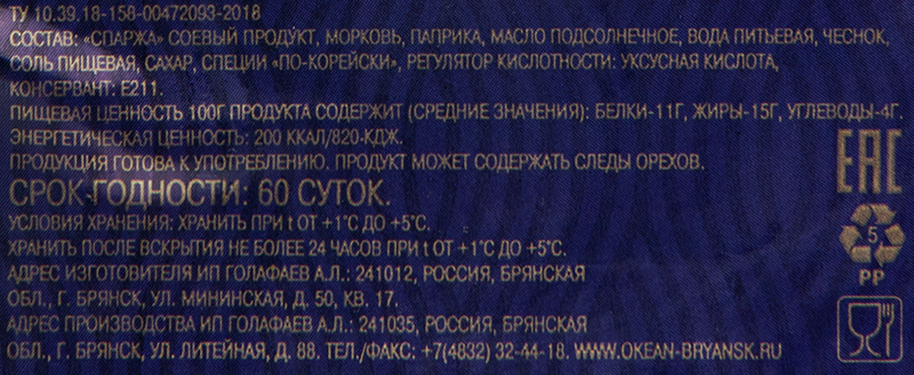 Спаржа соевый продукт, морковь, паприка, масло подсолнечное, вода питьевая, чеснок, соль пищевая, сахар, специи по-корейски, регулятор кислотности: уксусная кислота, консервант Е211.
