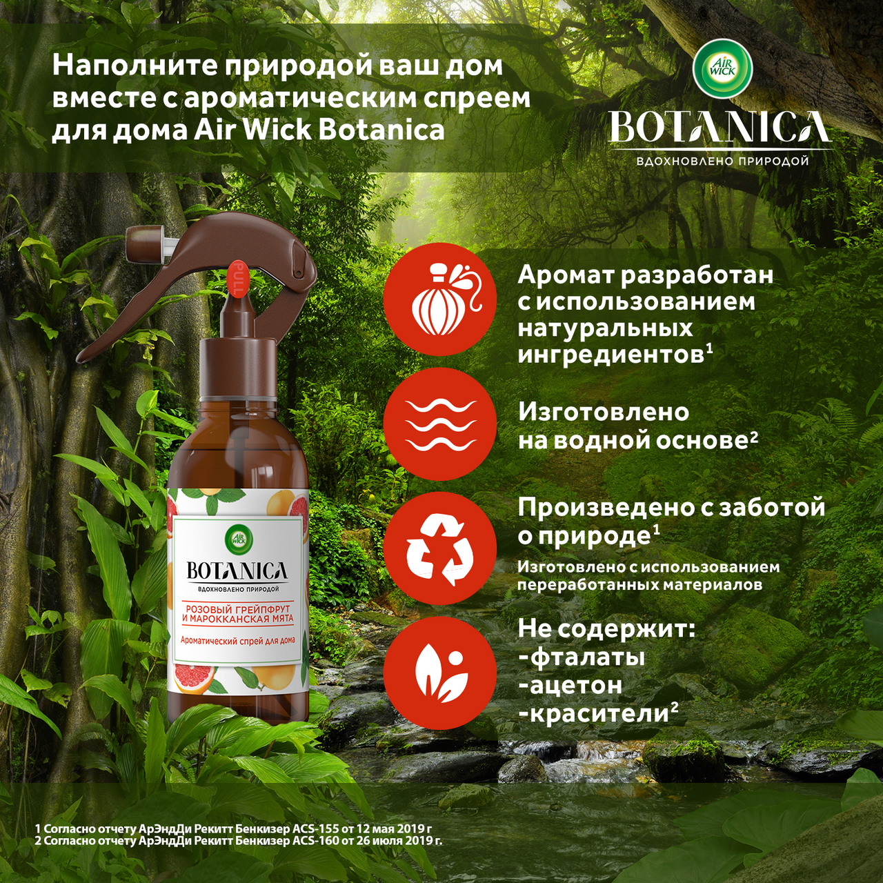 Насладитесь бодрящим ароматом розового грейпфрута в сочетании с тонкими мятными нотками.* Ощутите взрыв свежести с ароматическим спреем Air Wick Botanica, утонченные нотки которого мгновенно наполнят природой Ваш дом. *Согласно отчету АрЭндДи Рекитт Бенкизер № ACS-152 от 12 мая 2019 г.