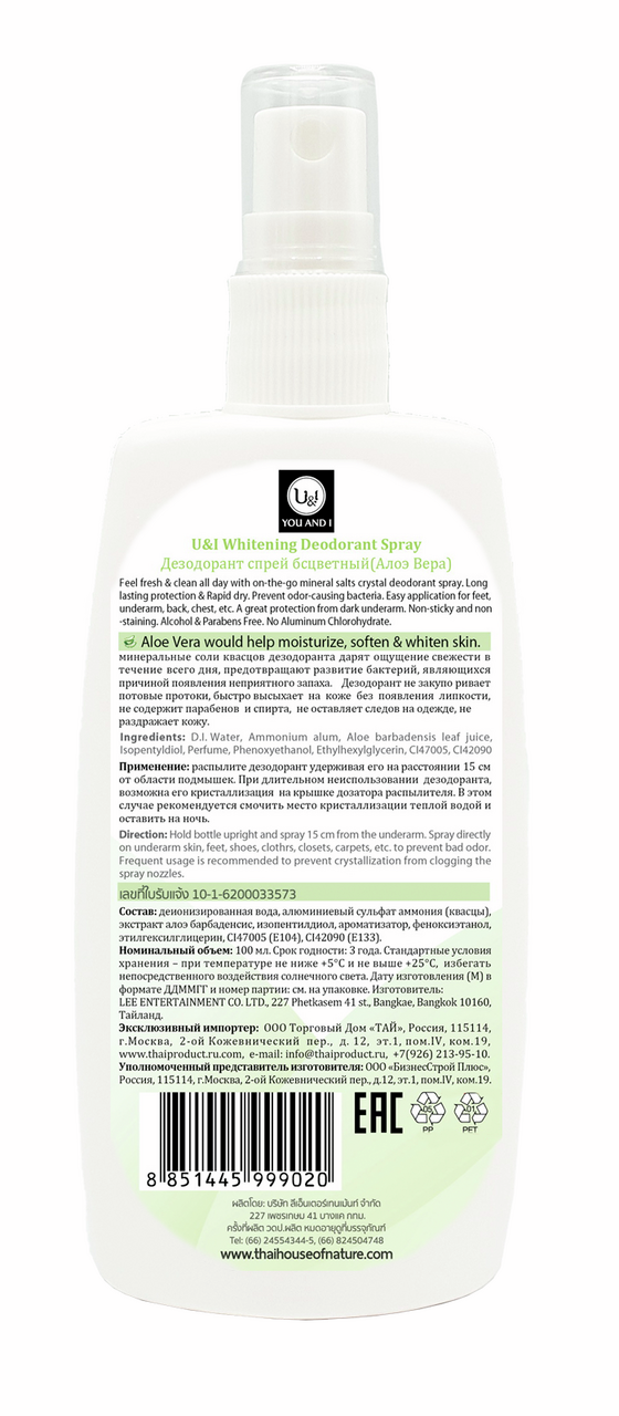 Дезодорант-спрей U&I Whitening Aloe Vera, 100мл
