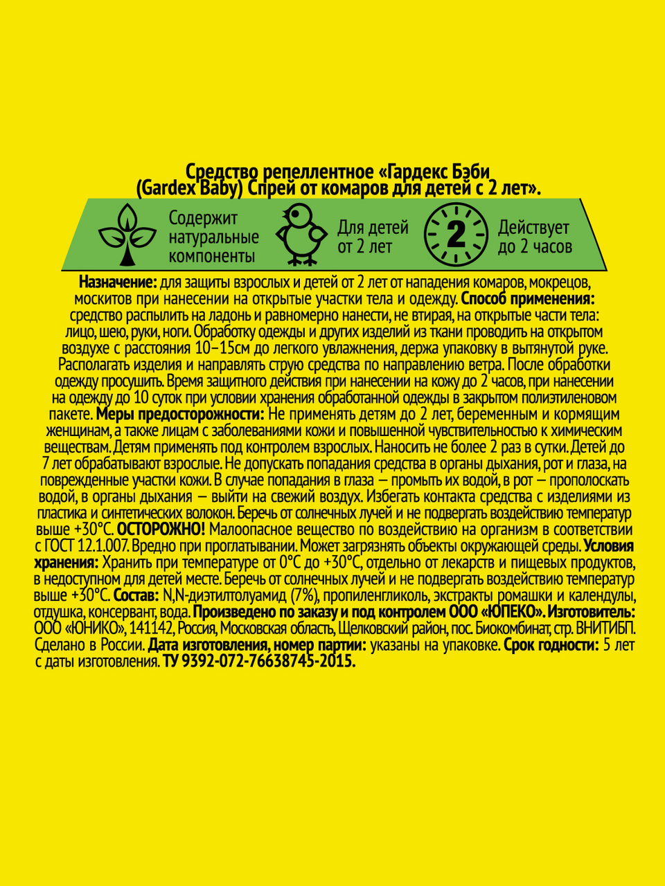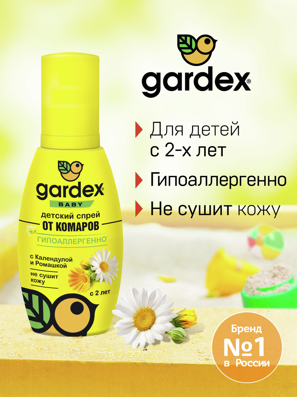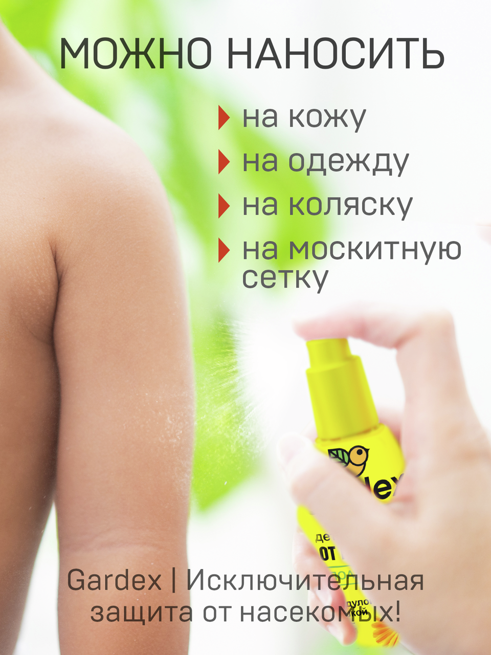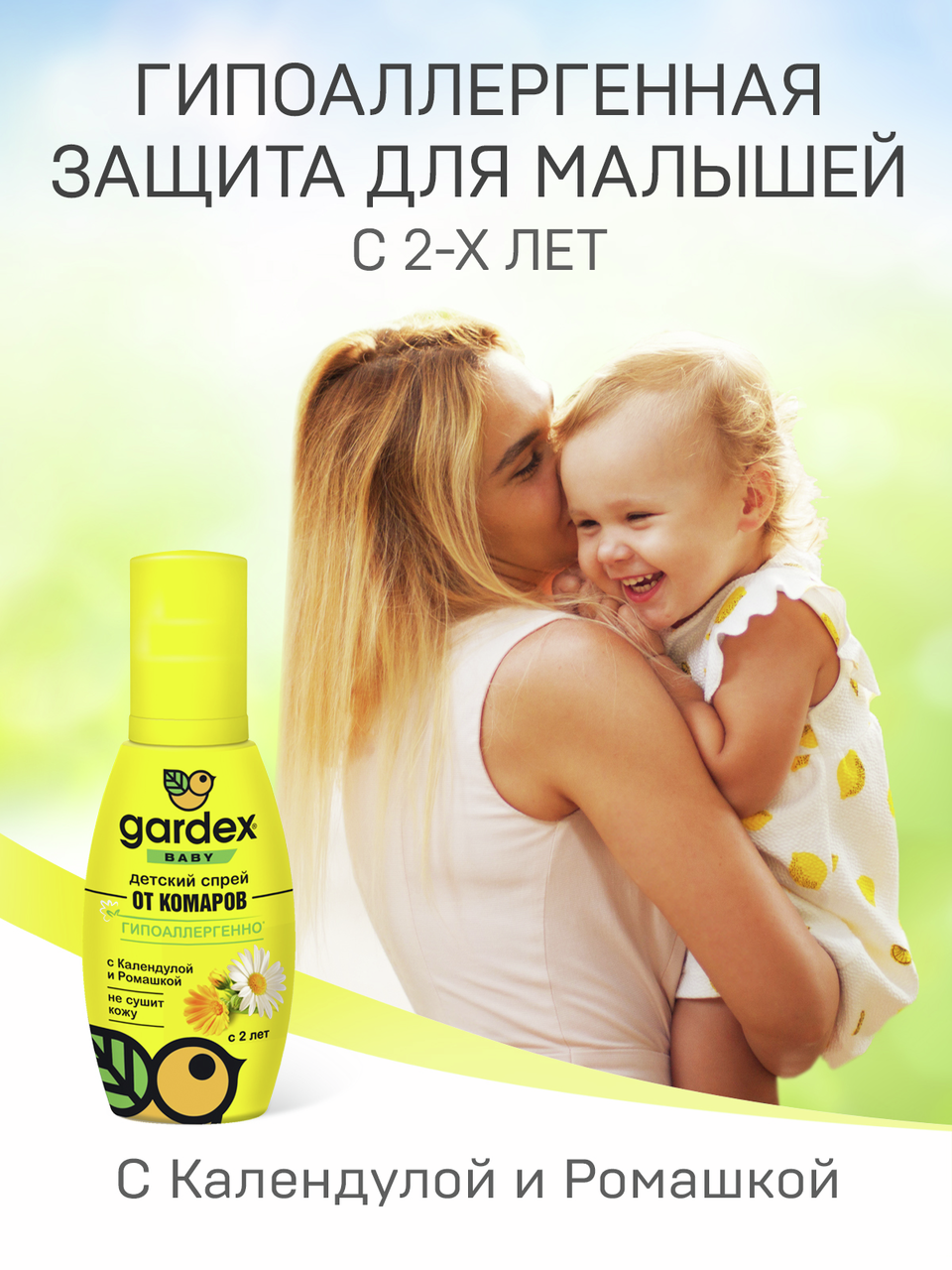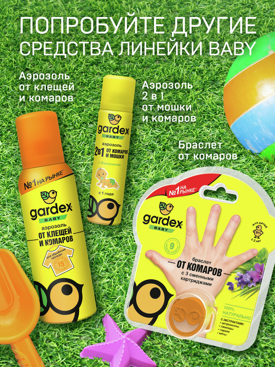 Спрей от комаров Gardex Baby, 100мл представляет собой гипоаллергенный аэрозоль, который предназначен для применения на открытых участках тела для детей. Данное средство является довольно эффективным в отношении комаров и других различных летающих и ползающих насекомых. Его можно использовать круглый год. После распыления эффект от аэрозоля длится примерно 2 часа. Действие средства связано с неприятным для паразитов запахом. Существует несколько особенностей применения. Спрей следует использовать не чаще двух раз в сутки. Не наносить на поврежденные участки кожи. В случае попадания в глаза, рот необходимо тщательно промыть теплой водой. Поставляется в небольшом баллоне, который удобно брать с собой в путешествие, на дачу или пикник. Хранить рекомендуется в темном месте, вдали от воздействия прямых солнечных лучей. Gardex – это популярный бренд, который представляет целую серию эффективных и безопасных для здоровья средств защиты от различных насекомых. Он появился на рынке более 12 лет назад. Состав продукции разрабатывается совместно со специалистами Института Дезинфектологии. Отличительными особенностями торговой марки являются: удобство использования и высокое качество.