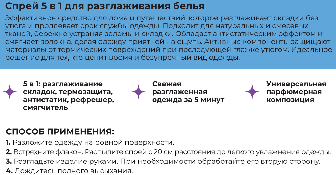 Эффективное средство для дома и путешествий, которое разглаживает складки без утюга и продлевает срок службы одежды. Подходит для натуральных и смесевых тканей, бережно устраняя заломы и складки. Обладает антистатическим эффектом и смягчает волокна, делая одежду приятной на ощупь. Активные компоненты защищают материалы от термических повреждений при последующей глажке утюгом. Идеальное решение для тех, кто ценит время и безупречный вид одежды.
