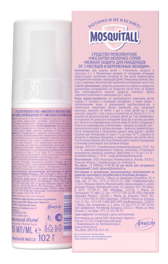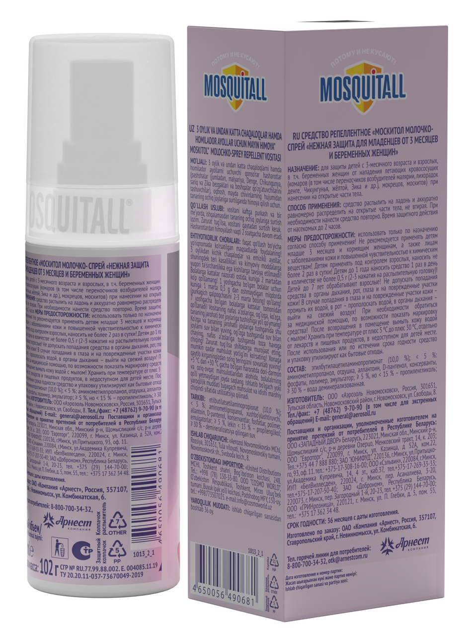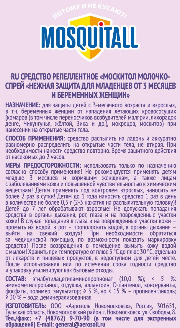 Молочко-спрей Mosquitall - это ваш надежный барьер против комаров, москитов и других крылатых вредителей. Его безопасная гипоаллергенная формула разработана специально для беременных и детей от 3 месяцев, обеспечивая до 2 часов экстразащиты, во время отдыха на природе, на рыбалке, прогулок в лесу или на дачном участке. Средство 2 в 1 отпугивает назойливых насекомых, а также, помогает снять зуд и раздражение если укус всё-таки произошел. Эффективная формула на основе 10% этилбутилацетиламинопропионата (IR3535), пантенола и аллантоина, делает его эффективным против широкого спектра кровососущих насекомых включая комаров, мошек, москитов, мокрецов и слепней, минимизируя риск укусов и возможных инфекций. Пантенол и аллантоин нежно ухаживают, снимают раздражение и увлажняют, оставляя приятное ощущение на коже. Это профессиональное средство подходит для использования как в открытых пространствах, так и в квартире и доме, где необходимо обезопаситься от надоедливых насекомых.
