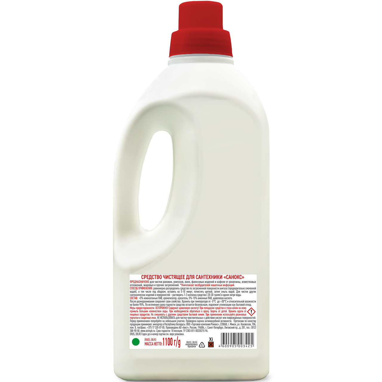 Это жидкое чистящее средство на основе щавелевой кислоты. Отлично удаляет ржавчину, придает блеск и сияние поверхности, уничтожает вредные микробы. Благодаря превосходным чистящим качествам "Санокс" является лидером на российском рынке среди чистящих средств для сантехники. Уничтожает возбудителей стафилококка и кишечных инфекций. Предназначено для чистки раковин, унитазов, кафеля и другого сантехнического оборудования от ржавчины, известковых отложений, жировых и прочих загрязнений.