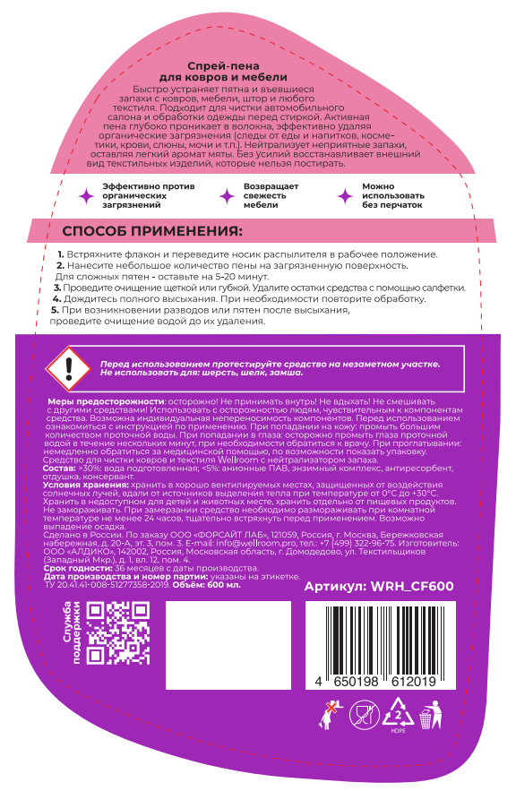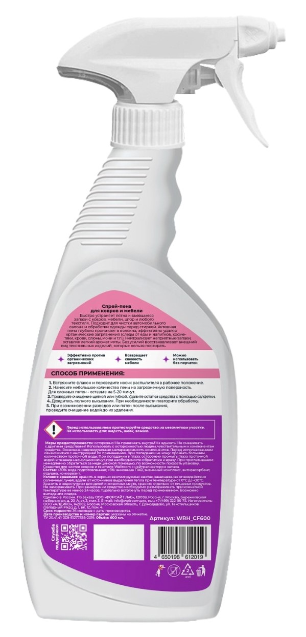 Средство чистящее Wellroom спрей-пена для ковров антипятна, 600мл