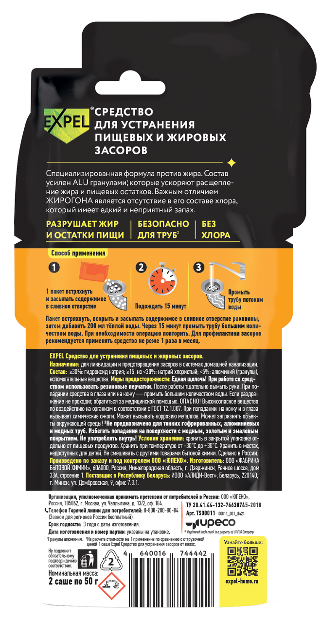 Средство для устранения пищевых и жировых засоров Expel в саше (50г x 2шт), 100г