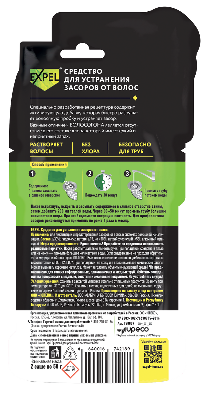Средство для устранения засоров от волос Expel в саше (50г x 2шт), 100г
