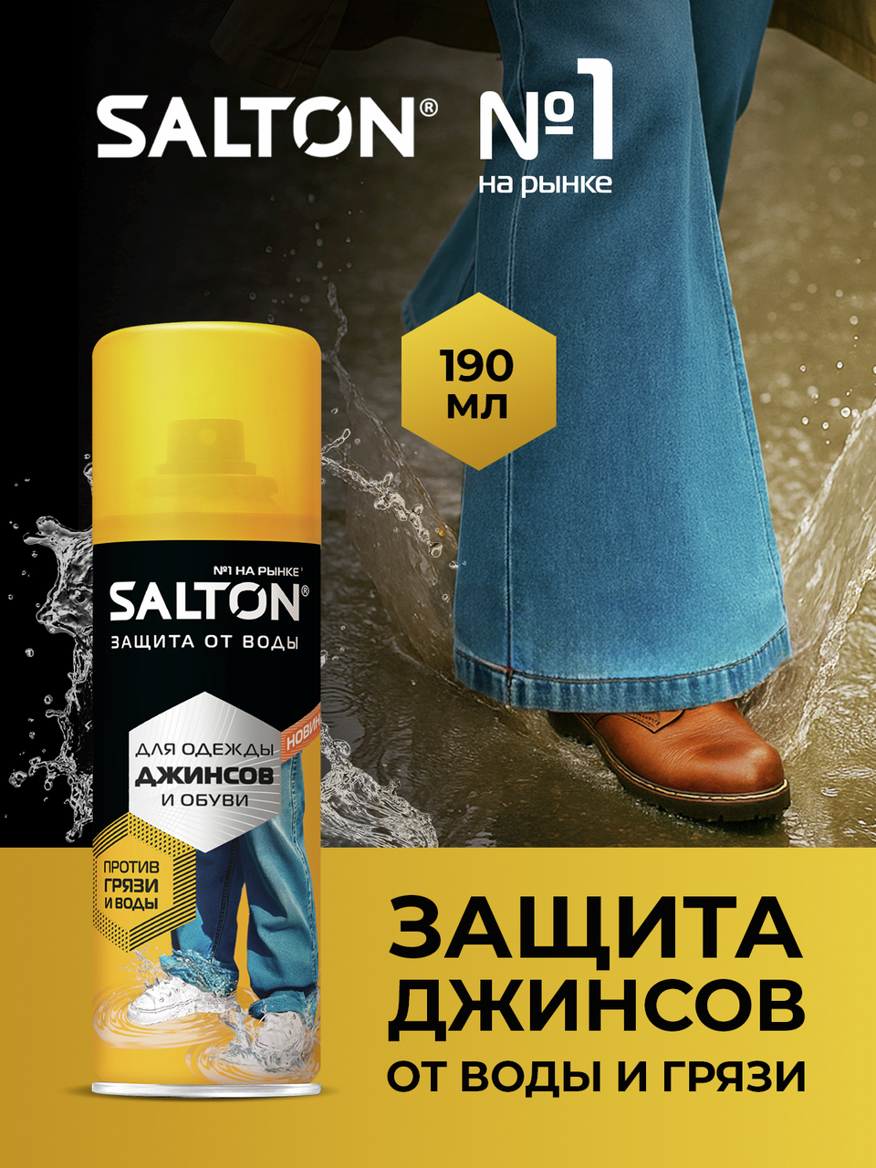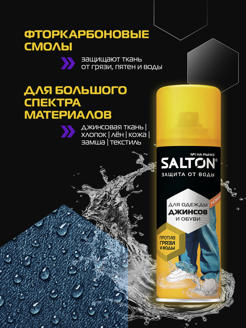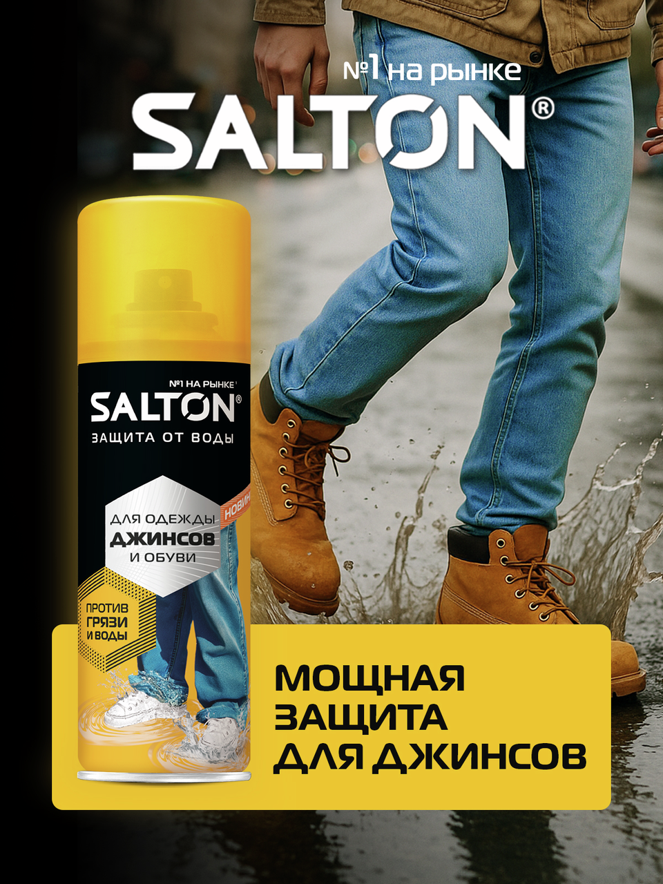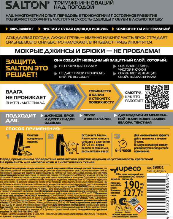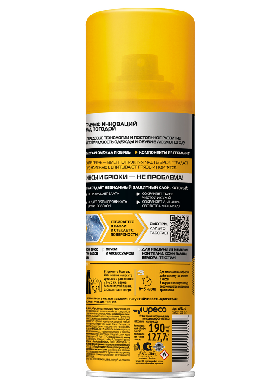Защита от воды и грязи для джинсов и одежды от Salton. Мокрые джинсы - больше не проблема. Инновационное водоотталкивающее средство Salton создаёт невидимый защитный слой, который имеет ряд преимуществ:- Не пропускает влагу, - Предотвращает проникновение грязи внутрь материала, - Сохраняет ткань чистой и сухой, - Поддерживает дышащие свойства материала, Одежда меньше пачкается, легче очищается. Подходит для обуви, одежды и других изделий из кожи, замши, нубука, ткани и мембранных материалов. Благодаря удобному распылителю, пропитки Salton extreme хватит на обработку 15-ти пар обуви. Водоотталкивающий спрей Экстра защита от воды Salton extreme послужит мощной защитой от воды для Вашей обуви и одежды.