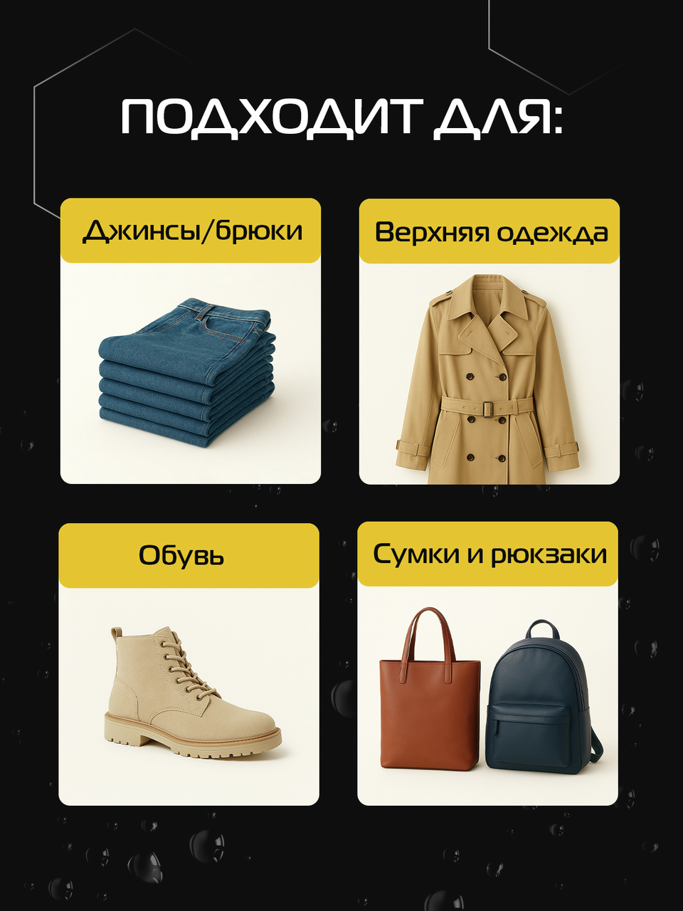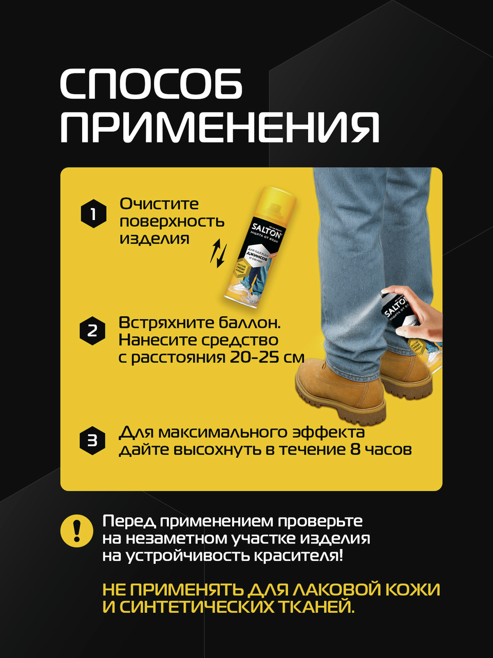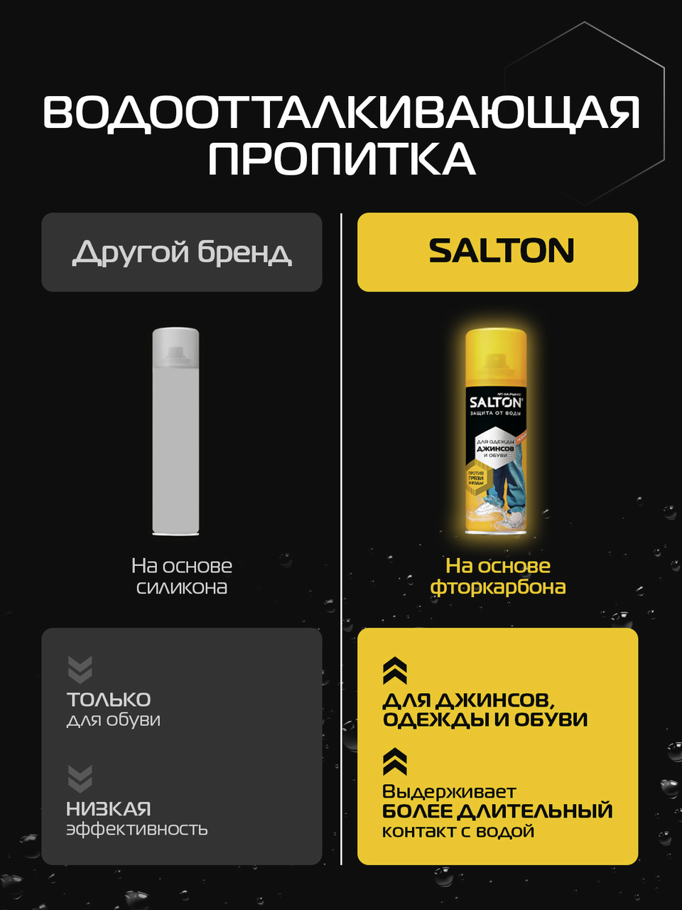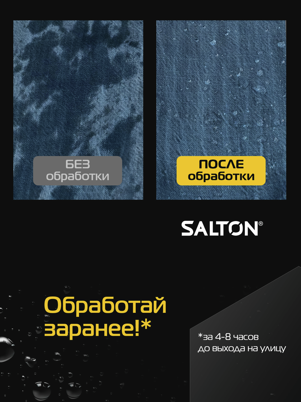 Защита от воды и грязи для джинсов и одежды от Salton. Мокрые джинсы - больше не проблема. Инновационное водоотталкивающее средство Salton создаёт невидимый защитный слой, который имеет ряд преимуществ:- Не пропускает влагу, - Предотвращает проникновение грязи внутрь материала, - Сохраняет ткань чистой и сухой, - Поддерживает дышащие свойства материала, Одежда меньше пачкается, легче очищается. Подходит для обуви, одежды и других изделий из кожи, замши, нубука, ткани и мембранных материалов. Благодаря удобному распылителю, пропитки Salton extreme хватит на обработку 15-ти пар обуви. Водоотталкивающий спрей Экстра защита от воды Salton extreme послужит мощной защитой от воды для Вашей обуви и одежды.