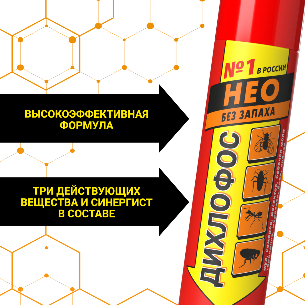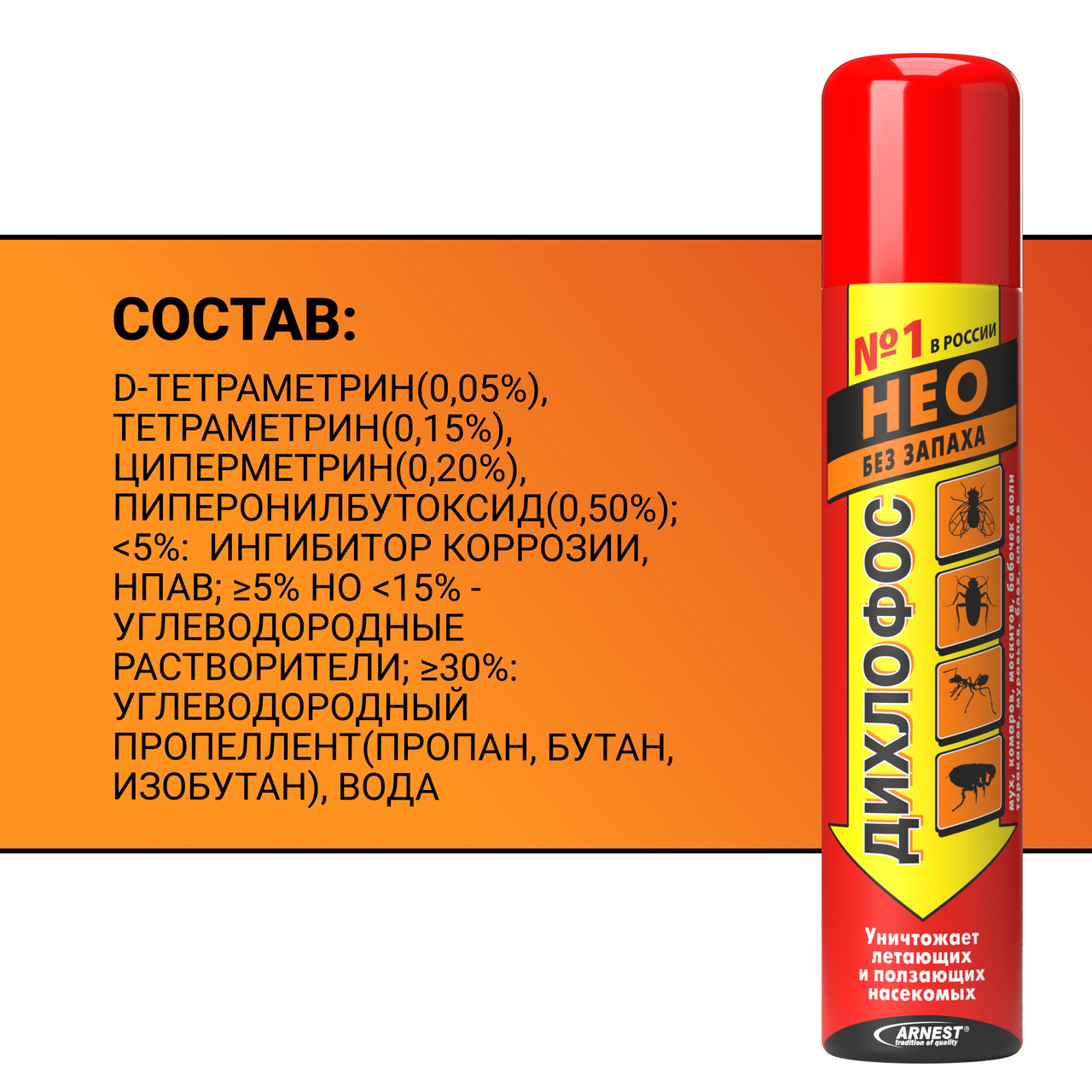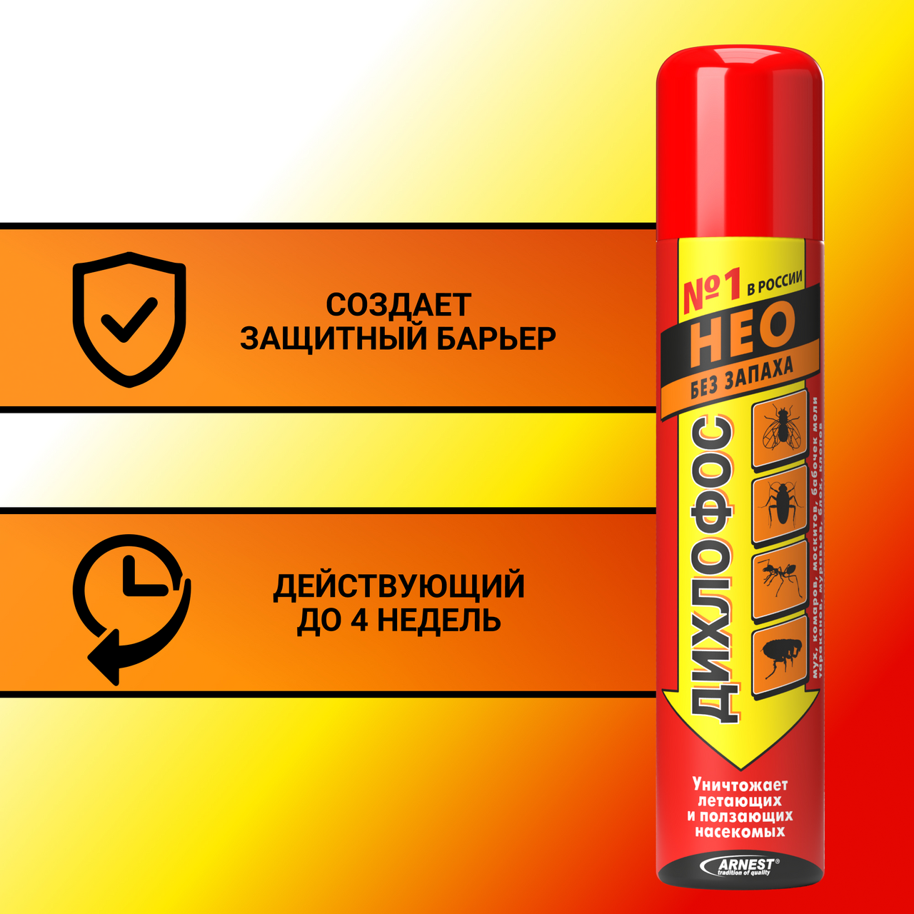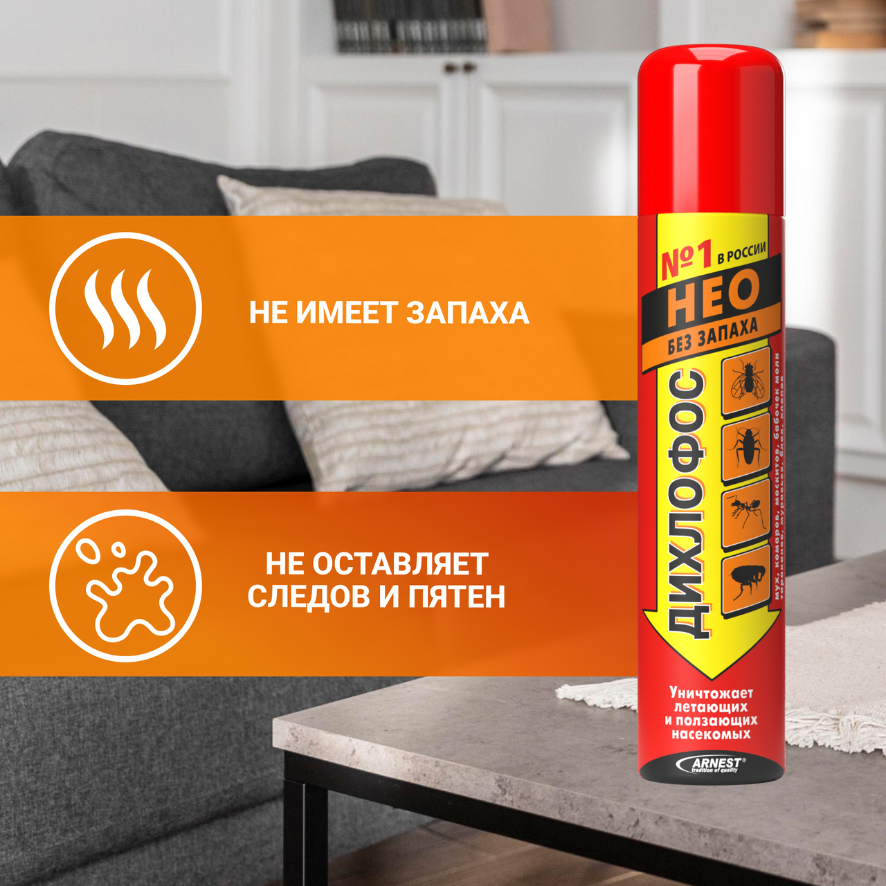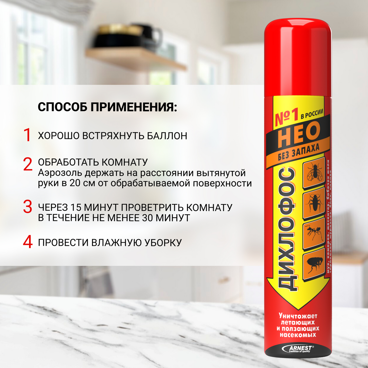 Избавьтесь от надоедливых насекомых раз и навсегда с профессиональным средством Дихлофос Нео! Это мощное средство, разработанное для быстрого и надёжного уничтожения тараканов, мух, постельных клопов, муравьёв, блох, комаров, ос, мошек и других насекомых, которые могут доставлять дискомфорт в вашем доме или квартире. Благодаря усовершенствованной формуле из трёх действующих веществ и синергиста в составе, оно гарантирует быстрое и долговременное решение проблемы, обеспечивая чистоту и комфорт в вашем жилище. Важным преимуществом является, что это продукт без запаха, который характерен для традиционных инсектицидов. Уничтожитель мух и моли разработан с учётом современных требований к безопасности и комфорту, что делает его подходящим для использования в жилых помещениях. После обработки помещение быстро проветривается, возвращаясь к привычному состоянию.
