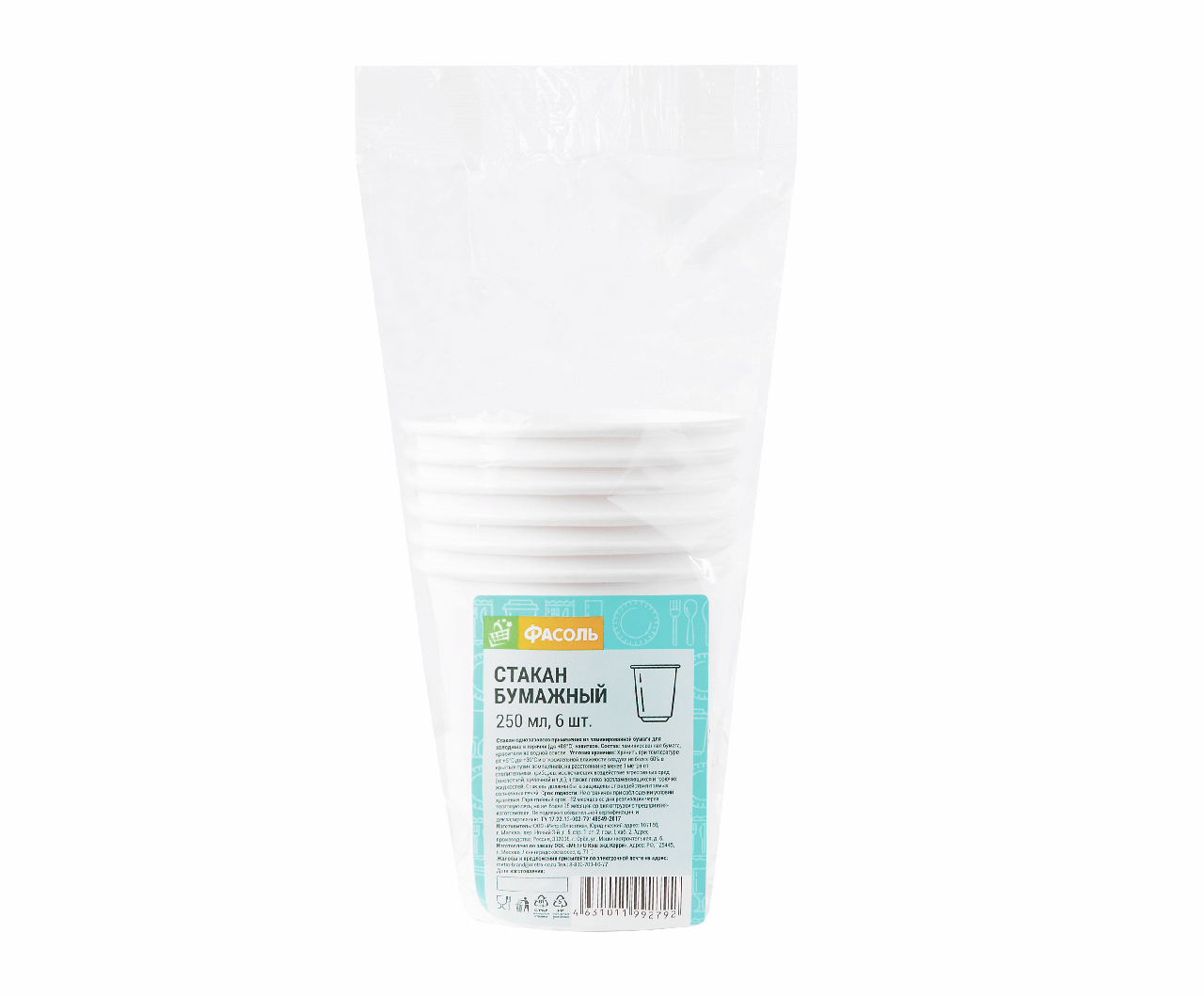 Стакан одноразовый Фасоль бумажный белый 250мл, 6шт