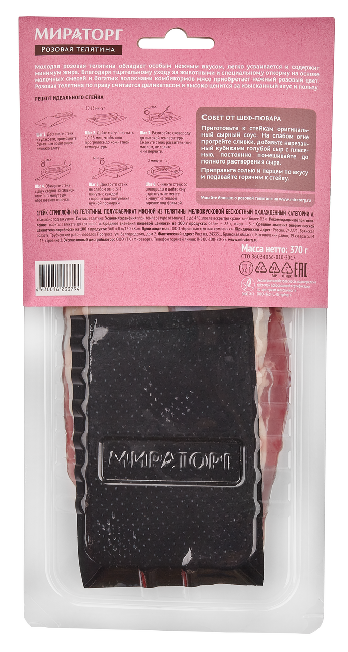 Стейк Мираторг Стриплойн из розовой телятины 370г – мясные кусочки с небольшой жировой прослойкой, благодаря которой они получаются особенно сочными. Аппетитные стейки, полученные из тонкого края, готовятся за считанные минуты и считаются деликатесом. Для производства используется мясо бычков возрастом до 8 месяцев. Оно имеет розовый цвет благодаря особому уходу за животными и использованию легких и полезных кормов без железа. Такое мясо считается диетическим, оно богато белком и ценными микроэлементами. Обжарьте стейк на сковороде с двух сторон до образования золотистой хрустящей корочки, запеките в духовом шкафу или приготовьте на гриле. Высококачественная вакуумная упаковка надежно сохраняет свежесть продукта в пределах всего срока годности.