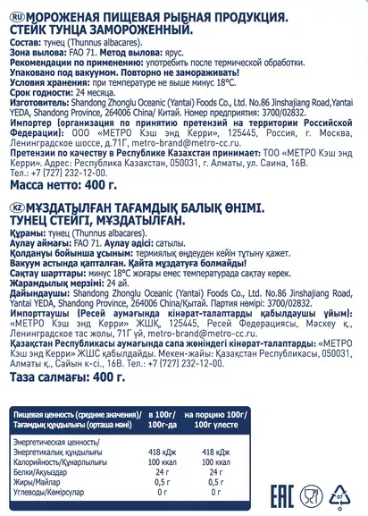 METRO Chef Стейк тунца свежемороженый, 400 г по вкусу напоминает мясо. Не зря его еще называют морская телятина. Такая рыба хорошо утоляет голод и благодаря высокому содержанию белка включается в низкоуглеводное меню. Стейки можно жарить на гриле и подавать в качестве горячего блюда с гарниром из риса или свежих овощей, а также использовать как ингредиент для приготовления салатов. Рыба выловлена в восточной части Индийского океана. Она разделана на ровные порционные стейки, каждый из которых помещен в отдельный вакуумный пакет. В одной упаковке находятся по два стейка общим весом 400 граммов. Сохранить все содержащиеся в тунце витамины, полезные микро- и макроэлементы помогает метод быстрой заморозки с образованием минимального слоя защитной глазури – его количество не превышает 5% от веса рыбы. Для размораживания стейков достаточно выдержать их около часа при комнатной температуре.
