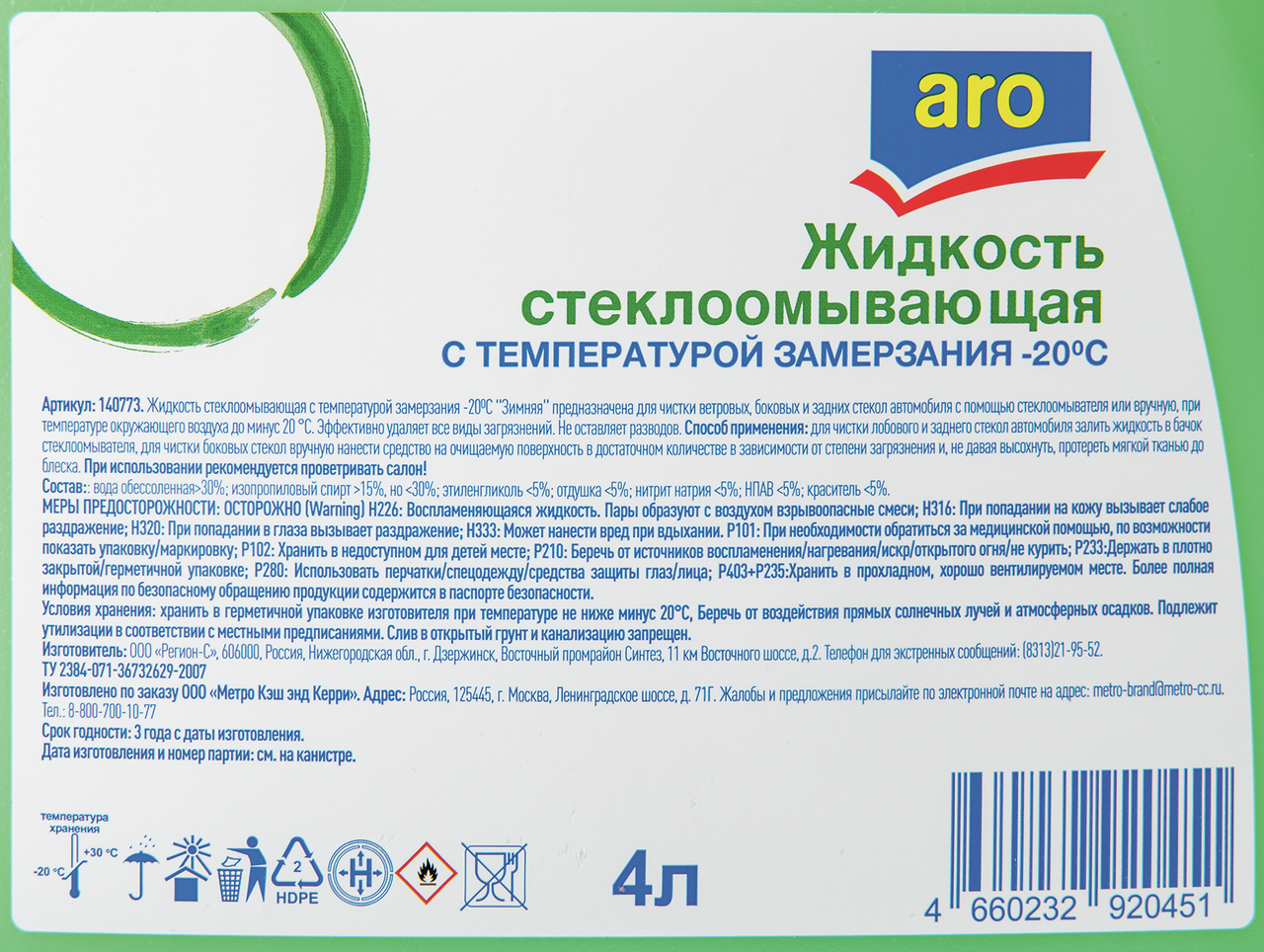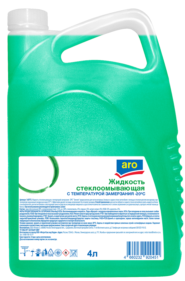 Aro Стеклоомыватель -20С, 4л предназначена для чистки ветровых, боковых и задних стекол автомобиля с помощью стеклоомывателя или вручную, при температуре окружающего воздуха до минус 20С. При использовании рекомендуется периодически проветривать салон! Эффективно удаляет все виды загрязнений. Не оставляет разводов.Хранить в герметичной упаковке изготовителя при температуре не ниже минус 20С. Беречь от воздействия прямых солнечных лучей и атмосферных осадков.