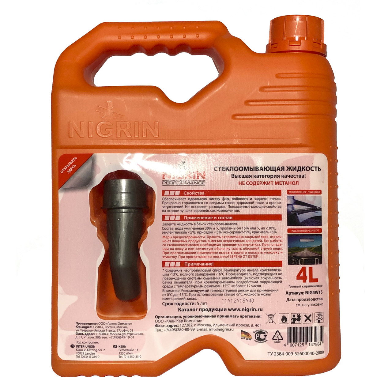 Стеклоомыватель Nigrin -15C, 4 л относится к категории зимних, которые рекомендуется эксплуатировать при температурах не ниже -15C. Эту жидкость можно назвать высокоэффективной благодаря ее составу. При ее изготовлении производитель использовал современные технологии (наночастицы) и добавку на спиртовой основе, благодаря которой жидкость не замерзает. Она способна быстро и эффективно очищать лобовое стекло машины от загрязнений разного типа. С помощью этого стеклоочистителя легко избавиться от грязи, а также от более сложных загрязнений (следов и пятен масла или жира). Стоит отметить, что этот зимний стеклоомыватель не только отлично выполняет свои функции, но и обладает защитными свойствами. Благодаря наночастицам все детали стеклоомывателя работают идеально, в составе нет веществ, которые могли бы способствовать их повреждению. Еще одно преимущество – отсутствие разводов после использования этой жидкости. Она отлично подходит для использования в осенне-зимний период.