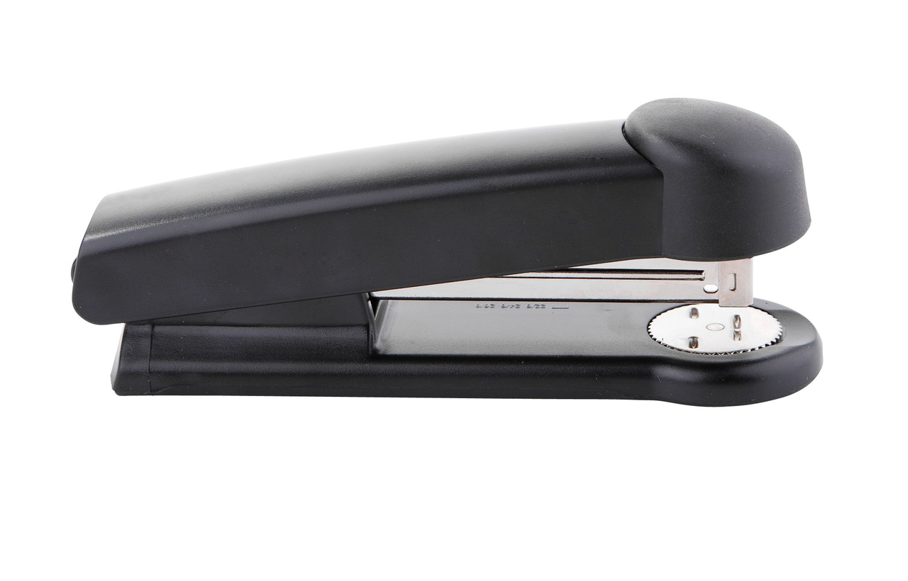 Пластмассовый степлер с металлическим механизмом. Максимальная толщина сшиваемой бумаги: 30 листов. Пластиковое основание не царапает поверхность. Сшивает открытым, закрытым и обивочным способом. Скобы вставляются сверху. Вместимость контейнера – 150 скоб №24/6, 210 скоб №26/6.