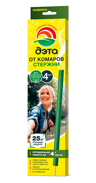 Стержни Дэта – это современное средство защиты, от комаров и других летающих насекомых для комфортного отдыха на природе. Универсальное средство идеально подойдет для любой активности на природе: пикники, походы, рыбалка или дачный отдых. Стержни эффективно и быстро справятся с насекомыми даже в местах их большого скопления, они удобны и просты в использовании, не ломаются и легко устанавливаются. Для обеспечения комплексной защиты во время активного отдыха рекомендуется использовать в сочетании со средствами индивидуальной защиты Дэта.