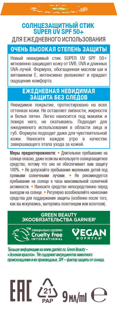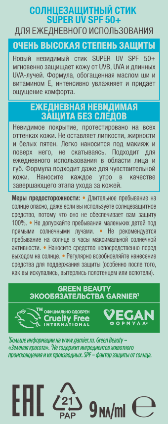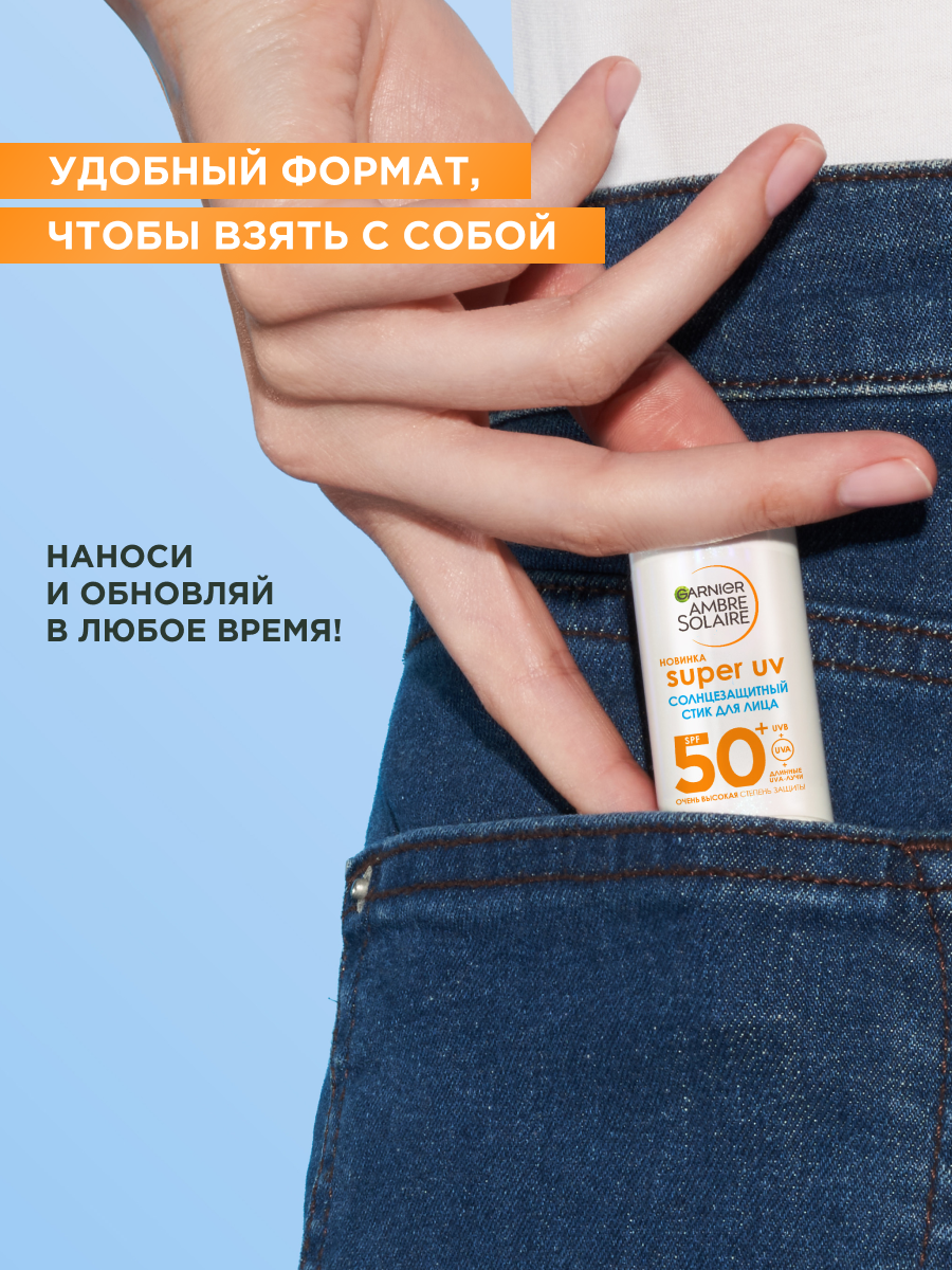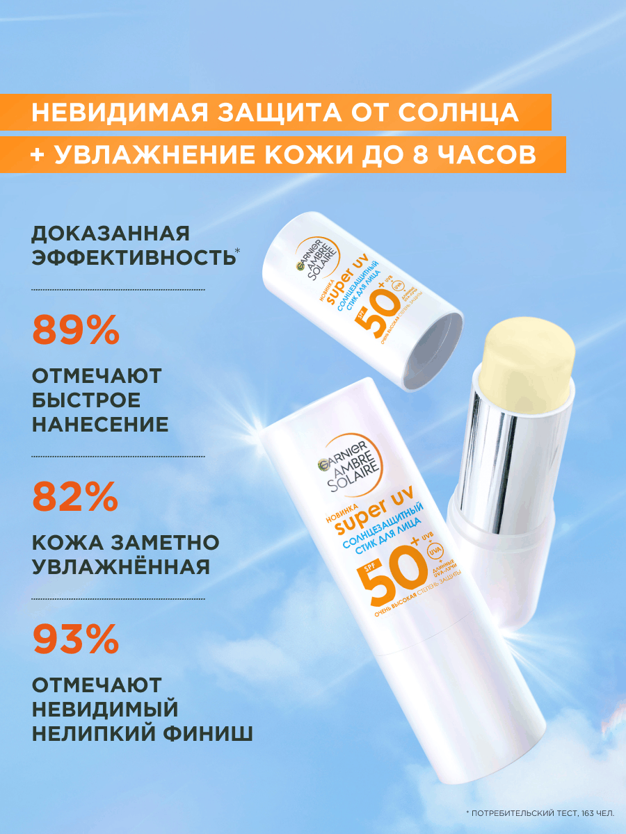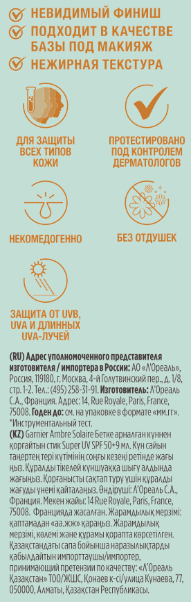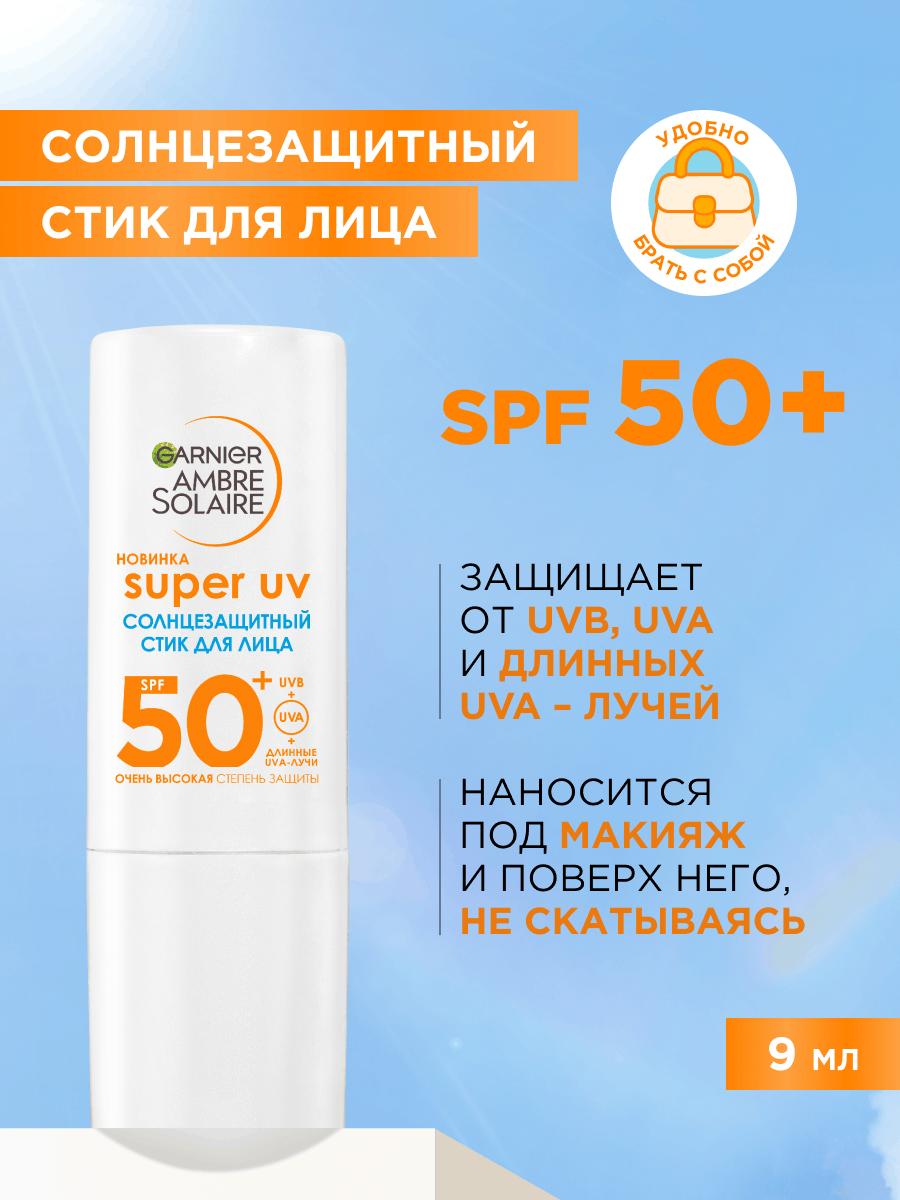 Солнцезащитный стик для лица и губ Garnier Ambre Solaire SPF50+ - это интенсивная защита от солнца в удобном формате 9 мл. Он обеспечивает эффективную защиту от всех типов UV-излучения: UVB-, UVA- и длинных UVA-лучей. Стик для лица с нежирной текстурой обеспечивает увлажнение на 8 часов, делая кожу заметно более гладкой. Стик обеспечивает невидимую защиту, которая подходит для любого тона кожи. Средство подходит для чувствительной кожи. Его можно наносить как под макияж, так и поверх него - он не скатывается и является идеальным решением для ежедневного ухода за лицом в городе и на отдыхе. Он не оставляет липкости, жирности и белых пятен. Стик солнцезащитный 50+ spf для лица обладает многокомпонентным ухаживающим действием: масло ши и какао смягчают и питают кожу, придавая ей бархатистость, а витамин Е выступает мощным антиоксидантом, защищая от негативных внешних факторов. Формула SPF50+ для лица некомедогенна и обеспечивает надежную защиту, предотвращая фотостарение и обезвоженность. Благодаря компактному размеру стик солнцезащитный 50+ spf для лица удобно взять с собой для быстрого обновления защиты от солнца в течение дня. Способ применения: Наносите каждое утро в качестве завершающего этапа ухода за кожей. Результат - надежно защищенная и ухоженная кожа без белых разводов и липкости. Стик для лица эффективен для защиты губ, для использования поверх тонального крема и в ситуациях, когда требуется быстрое и точное нанесение без зеркала. Garnier предлагает профессиональный уход для лица с оптимальной защитой, где невидимая UV-защита дает видимый результат - защищённую и увлажненную кожу.