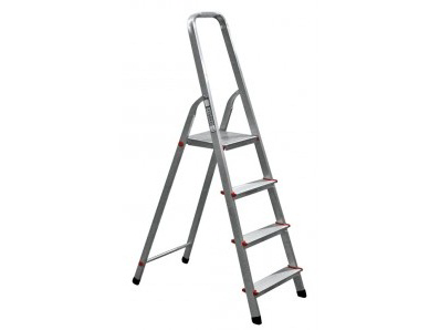легкая алюминиевая: небольшой вес, защита от действия коррозии 4 ступени надежно соединены с основным корпусом стремянки высокая дуга безопасности широкая рабочая площадка противоскользящие накладки на опорных ножках