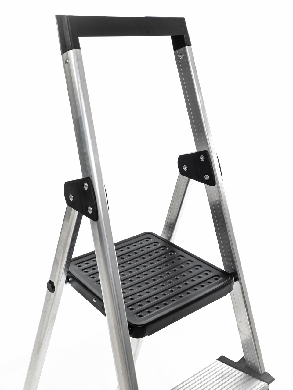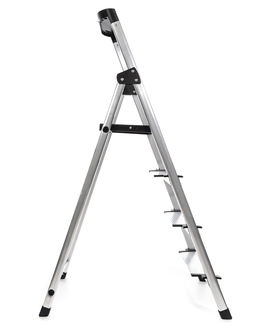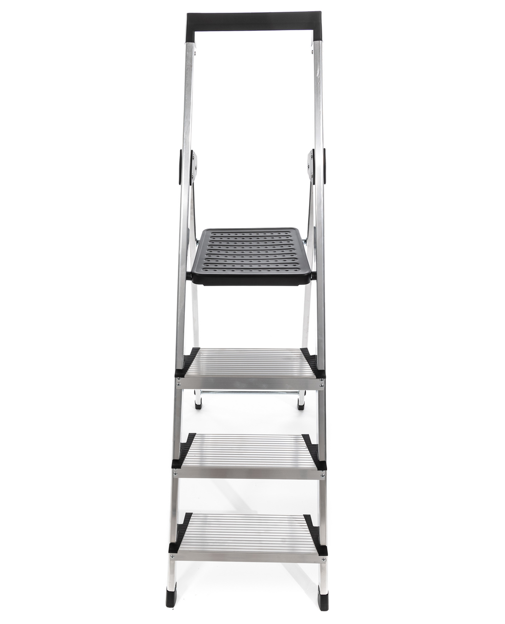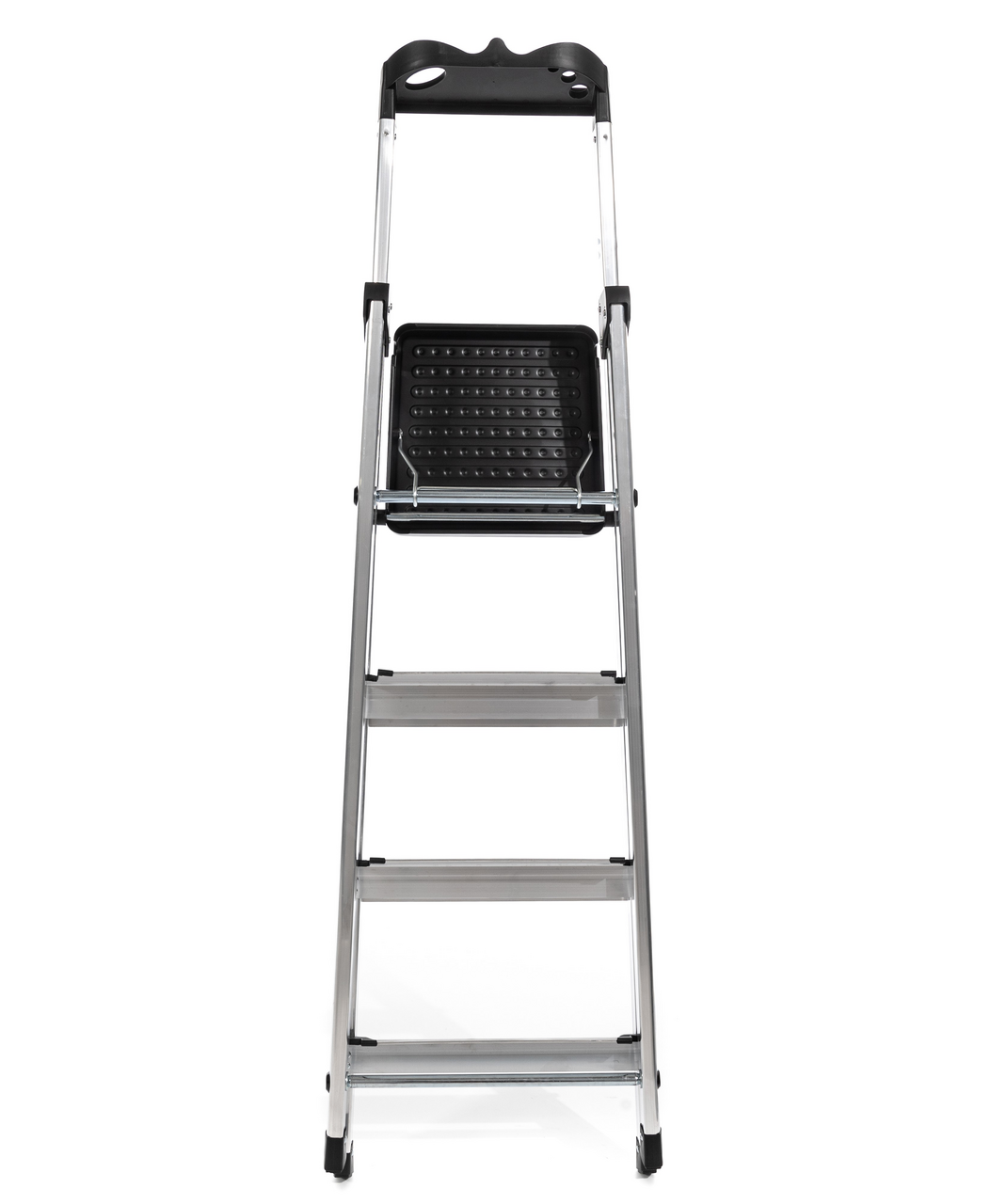Стремянка алюминиевая с 4 ступенями и лотком для инструментов. Алюминиевый профиль в сочетании с алюминиевыми ступенями делают стремянку лёгкой и удобной в использовании. Ступени алюминиевые с рифленой поверхностью, шириной 12см. Верхняя площадка из стали, размер 28*26см. На верхней ручке расположен лоток для инструментов. Его размер 28,6*8,5см. Максимальная нагрузка на лоток - 8кг. Насадки на ножках обеспечивают стабильность и безопасность. Размер в разложенном виде: 42x74,5x137,9см. Вес: 3,76кг. Глубина ступени: 12см. Максимальная нагрузка 150кг. Расстояние от пола до верхней площадки 82,4см. Максимально достижимая высота 282,4см. Размер заднего профиля: 35х22мм. Размер переднего профиля: 40х22мм. Расстояние между ступенями 22см.