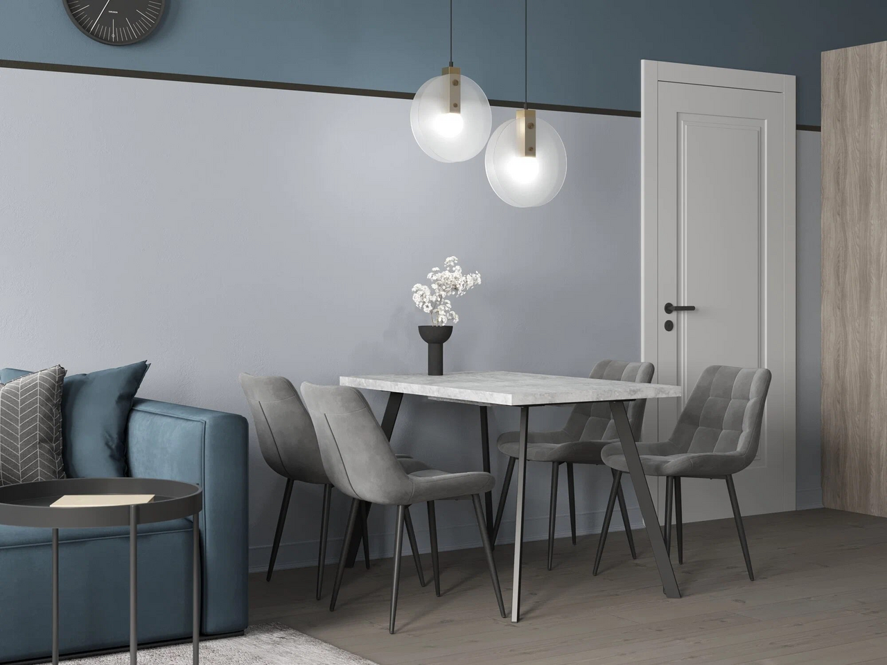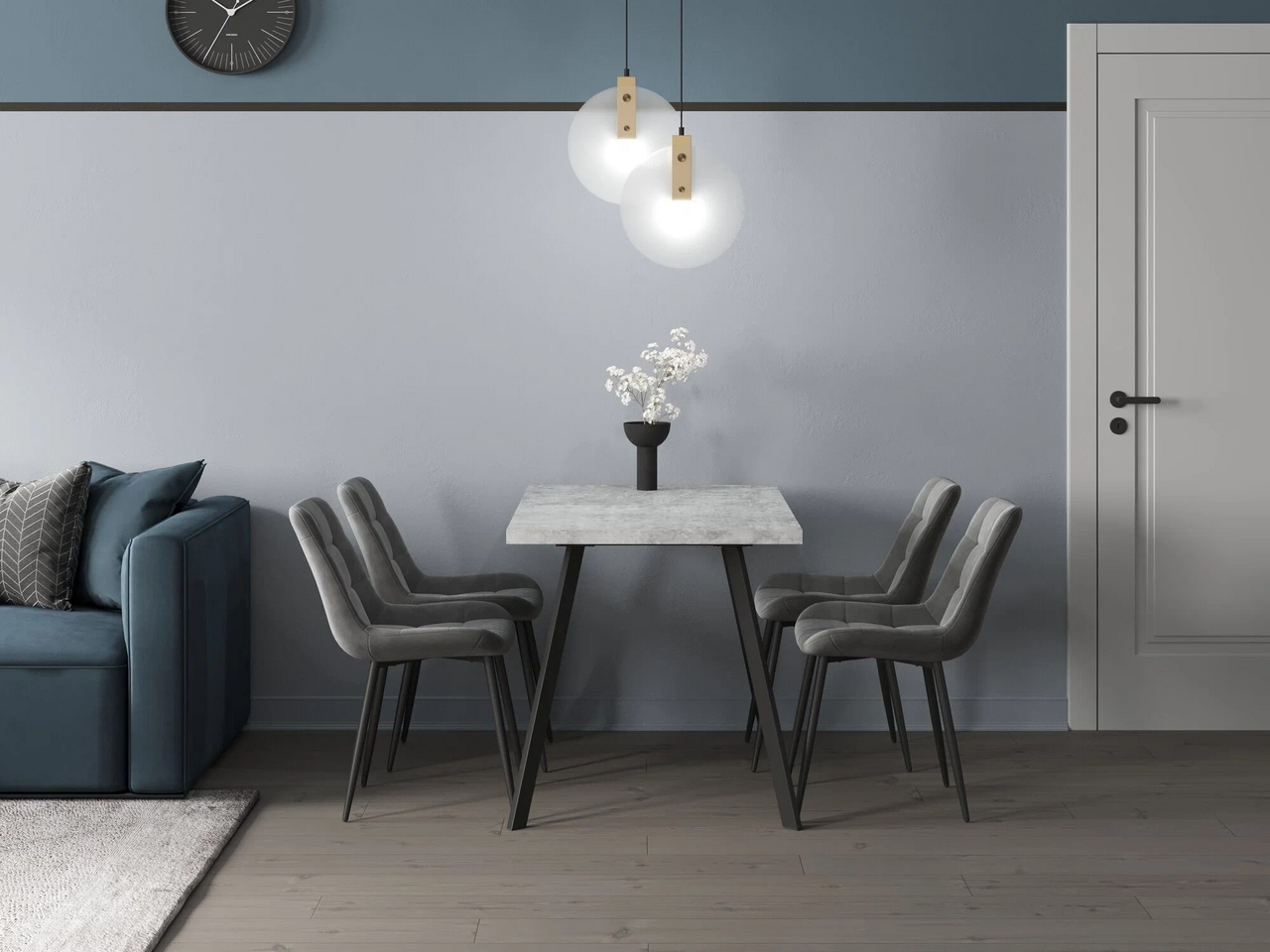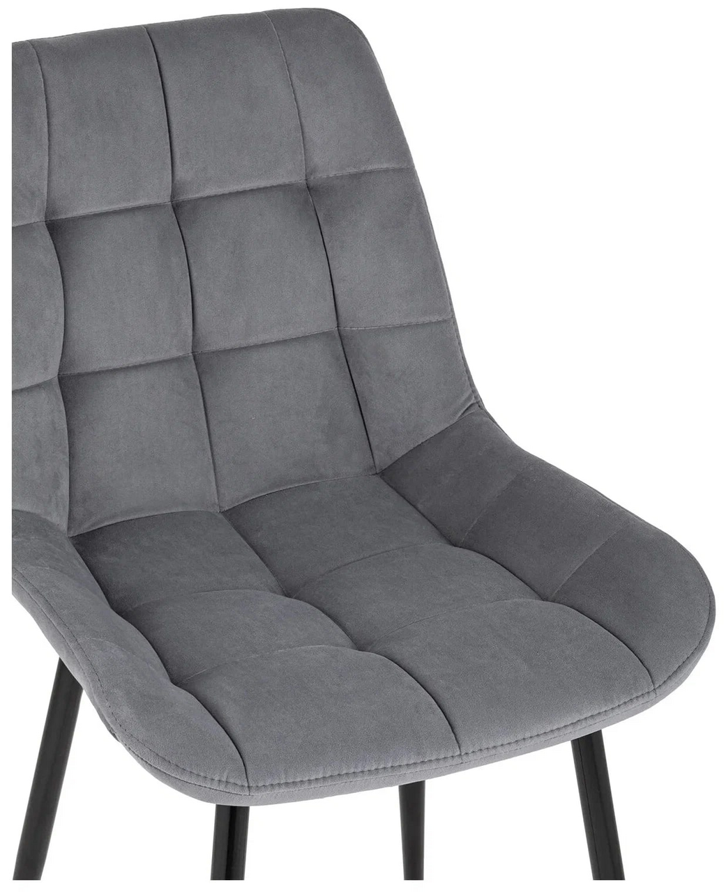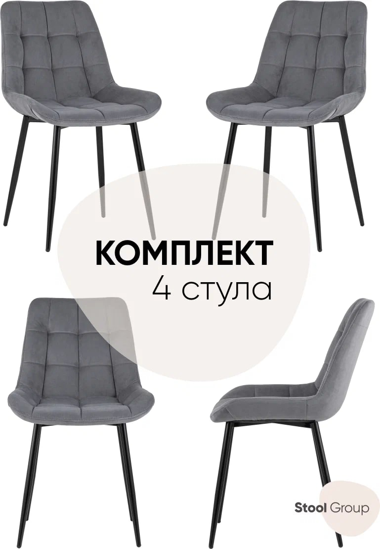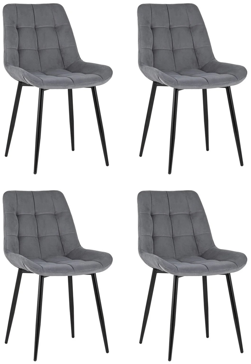 Стул Флекс (box) велюр серый, 1 x 4 шт — обеденный стул в мягкой обивке из велюра серого цвета без подлокотников. Черные ножки изготовлены из металла. Стул имеет удобную форму сиденья, комфортную поддерживающую спинку, а декоративная стяжка придает объём и защищает от образования вмятин. Лаконичный дизайн стульев подойдет к обеденному столу любого дизайна.