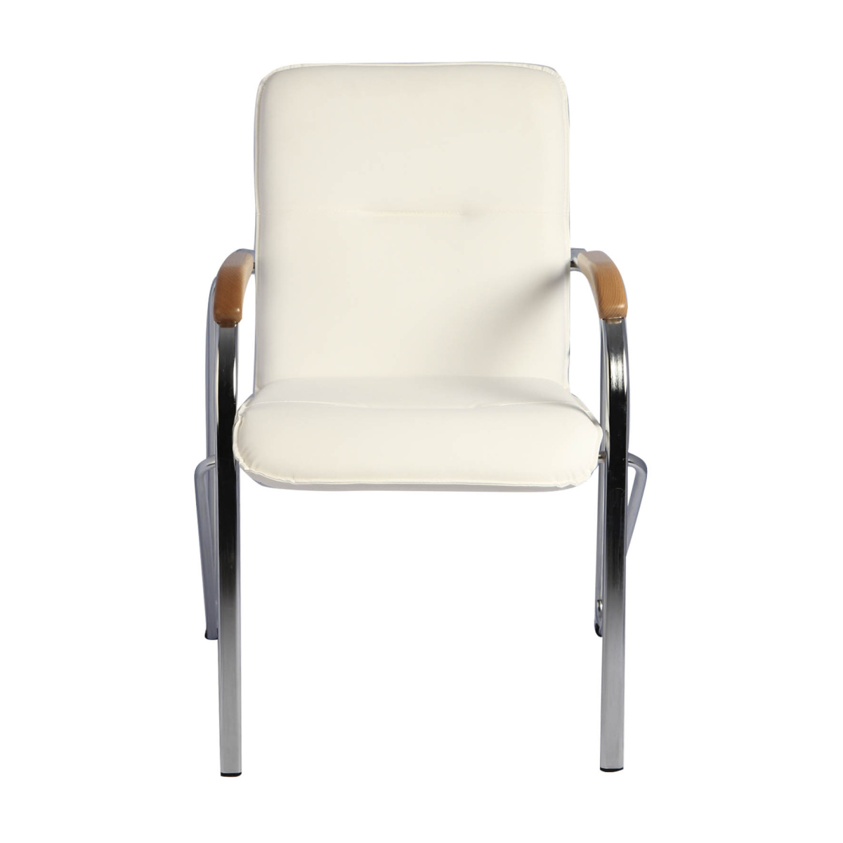 Стул Самба белый экокожа подлокотники бамбук, 2 шт подходит для конференц-залов, для приема посетителей в офисе, для дома. Обит искусственной кожей бежевого цвета. Каркас выполнен из хромированного металла, оснащен накладками для сохранности напольного покрытия. На подлокотниках - деревянные вставки цвета бук. Максимальная статическая нагрузка - 100кг.