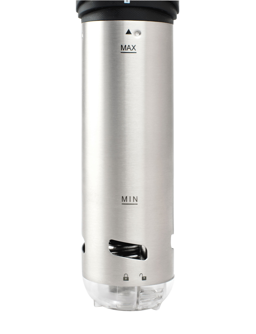 Погружной термостат Gemlux GL-SV800BLR предназначен для длительного низкотемпературного приготовления пищи на водяной бане в условиях домашней кухни. Продукты предварительно упаковываются в пластиковые пакеты при помощи бытового вакууматора. Оборудование оснащено электронной системой управления с ЖК-дисплеем. Температура регулируется в диапазоне 0-90оС с точностью до 0,1о, время приготовления - до 99 ч. Рециркуляционный насос производительностью до 8 л/мин обеспечивает равномерный нагрев воды. Погружной термостат может быть использован с любыми емкостями, объем которых составляет 6-15 л, в том числе с гастроемкостями из поликарбоната, поскольку температура приготовления не превышает 90оС. Устройство закрепляется на стенке емкости при помощи фиксатора. Металлический корпус и колпачок рециркуляционного насоса легко снимаются для очистки и технического обслуживания оборудования.