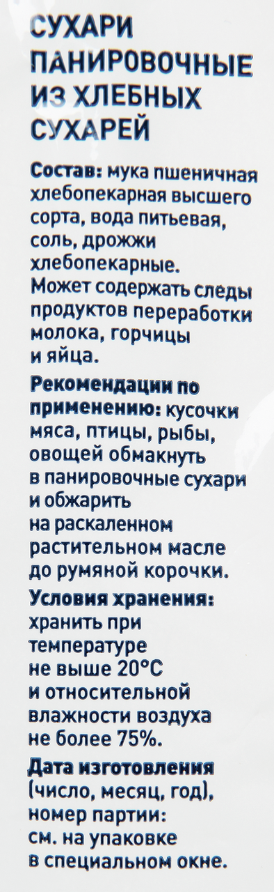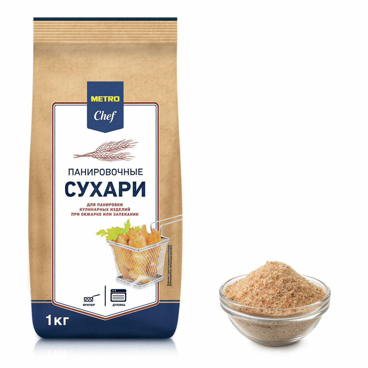 Сухари METRO Chef панировочные – сухарная крошка из хлеба. Применяется для обсыпки обжариваемых или приготавливаемых во фритюре блюд. Отлично подходит для изделий из рыбы, овощей, мяса, птицы. Сухари придают готовым продуктам презентабельный внешний вид, создают на поверхности аппетитную хрустящую корочку, снижают потерю влаги, позволяя мясу или рыбе оставаться сочным и нежным. Готовят полуфабрикат из высушенного белого хлеба и хлебных корок. Для блюд из фарша лучше выбирать сухарики мелкого помола, из мяса и рыбы – крупного.