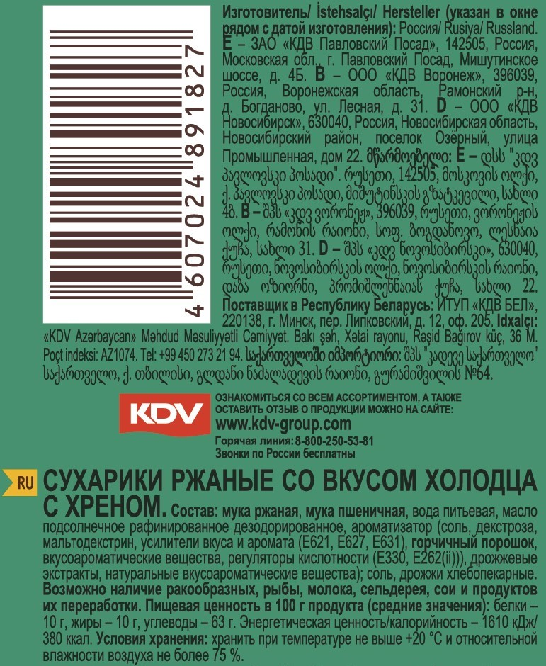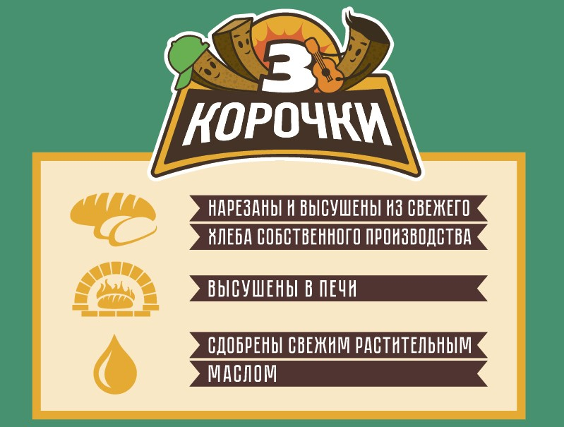 Ржаные сухарики со вкусом холодца с хреном. Сухарики производят без обжарки во фритюре. Эти ржаные сухарики созданы по уникальной технологии обжарки и ароматизации, которая сохраняет текстуру хлеба и раскрывает вкус специй. Ржано-пшеничные удлиненные сухарики: к пенным и прохладительным напиткам, супам и для перекуса.