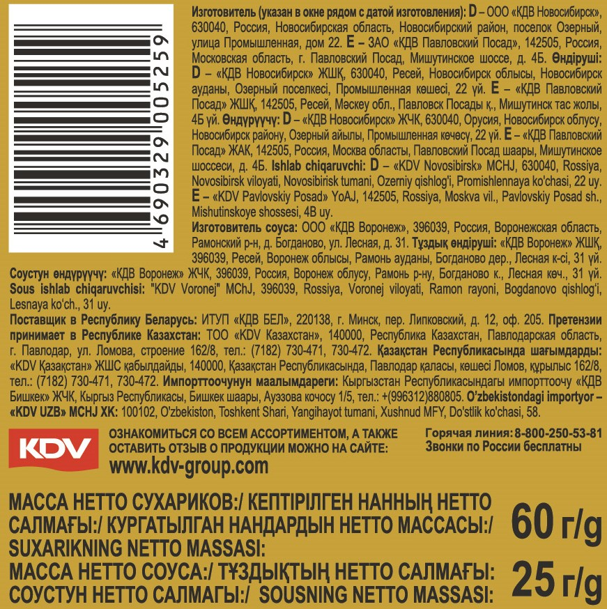Ржано-пшеничные сухарики: к пенным и прохладительным напиткам, супам и для перекуса.- Из свежеиспеченного хлеба.- Без обжарки во фритюре.- С пользой злаков. В пачке 60г сухариков и упаковка сырного соуса Calve 25мл.