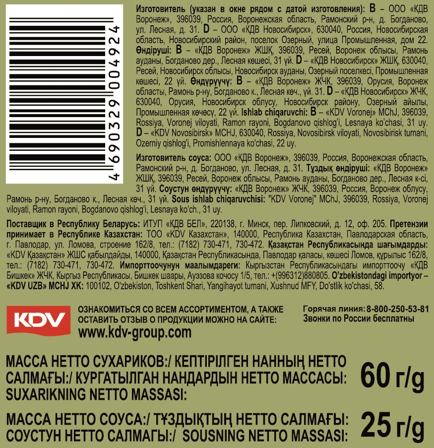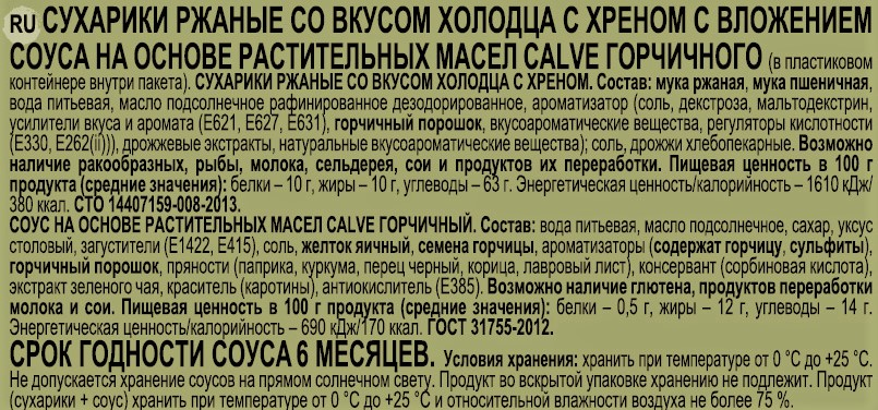 Сухарики ржаные: мука ржаная, мука пшеничная, вода питьевая, масло подсолнечное (содержит антиокислитель: Е319), ароматизатор (соль, декстроза, мальтодекстрин, усилители вкуса и аромата (Е621, Е627, Е631), горчичный порошок, вкусоароматические вещества, регуляторы кислотности (Е330, Е262(ii))), дрожжевые экстракты, натуральные вкусоароматические вещества); соль, дрожжи хлебопекарные; Соус на основе растительных масел Calve Горчичный: вода питьевая, масло подсолнечное, сахар, уксус столовый, загустители (Е1422, Е415), желток яичный, соль, горчица зерновая (вода питьевая, семена горчицы, спиртовой уксус, соль пищевая, сахар, пряности, ароматизатор натуральный), ароматизаторы (содержат горчицу, сульфиты), горчичный порошок, пряности (паприка, куркума, перец черный, корица, лавровый лист), экстракт зеленого чая, консервант (сорбиновая кислота), краситель (каротины), антиокислитель (Е385).