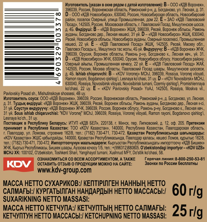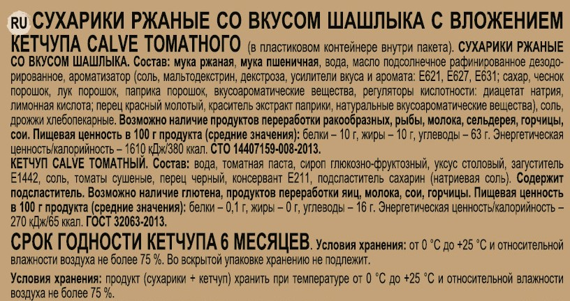 Сухарики ржаные: мука ржаная, мука пшеничная, вода, масло подсолнечное рафинированное дезодорированное, ароматизатор (соль, мальтодекстрин, декстроза, усилители вкуса и аромата: Е621, Е627, Е631; сахар, чеснок порошок, лук порошок, паприка порошок, вкусоароматические вещества, регуляторы кислотности: диацетат натрия, лимонная кислота; перец красный молотый, краситель экстракт паприки, натуральные вкусоароматические вещества), соль, дрожжи хлебопекарные; Кетчуп Calve томатный: вода, томатная паста, сироп глюкозно-фруктозный, уксус столовый, загуститель Е1442, соль, томаты сушеные, перец черный, консервант Е211, подсластитель сахарин (натриевая соль).