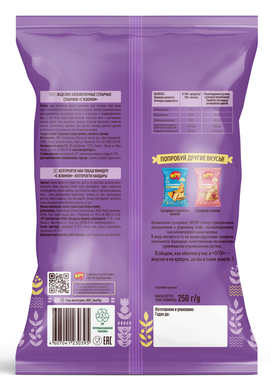 Сухари готовятся из сдобного теста с добавлением изюма. После запекания хлеб нарезается ломтиками и еще раз запекается в духовке. Это нужно, чтобы из свежего хлеба получились хрустящие сухари. На основе таких сухарей можно готовить сладкие бутерброды с джемом, вареньем, творогом или сгущенкой. Вкусные сухари сладкие ОГО отлично подойдут для семейного вечера и чаепития с друзьями.