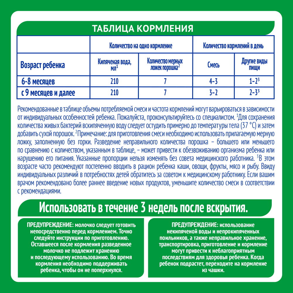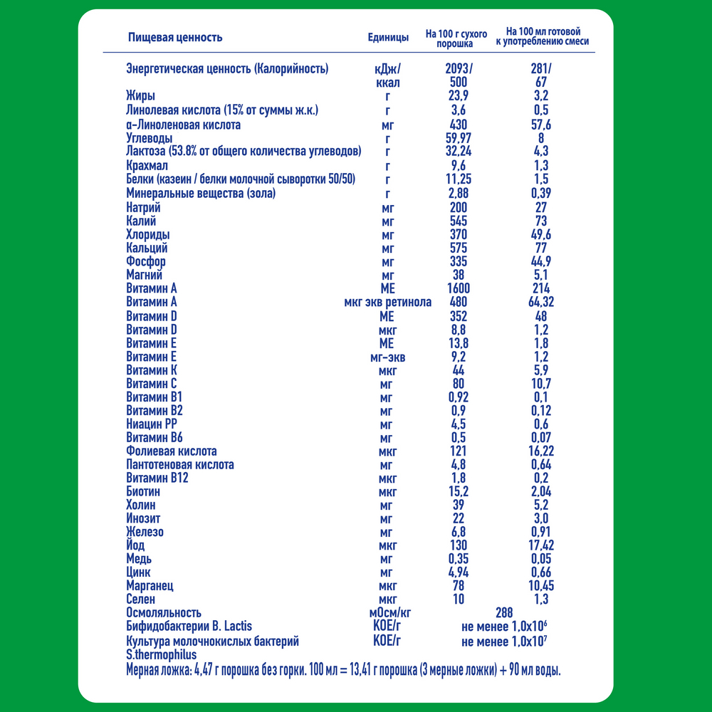 Состав: обезжиренное молоко, мальтодекстрин, лактоза, растительные масла, сывороточный белок, соевый лецитин, цитрат кальция, фосфат кальция, цитрат натрия, цитрат магния, рыбий жир, хлорид калия, витамины, сульфат железа, культура бифидобактерий, сульфат цинка, культура лактобацилл, сульфат меди, йодид калия, селенат натрия.Изготовлено с использованием сухой молочной сыворотки.Пищевая ценность на 100г: жиры 21,5г, б��лки 10,82г, углеводы 60,79г.Энергетическая ценность: 480ккал.До и после вскрытия продукт хранить при температуре не выше 25C и относительной влажности воздуха не более 75%.Срок годности: 2 года