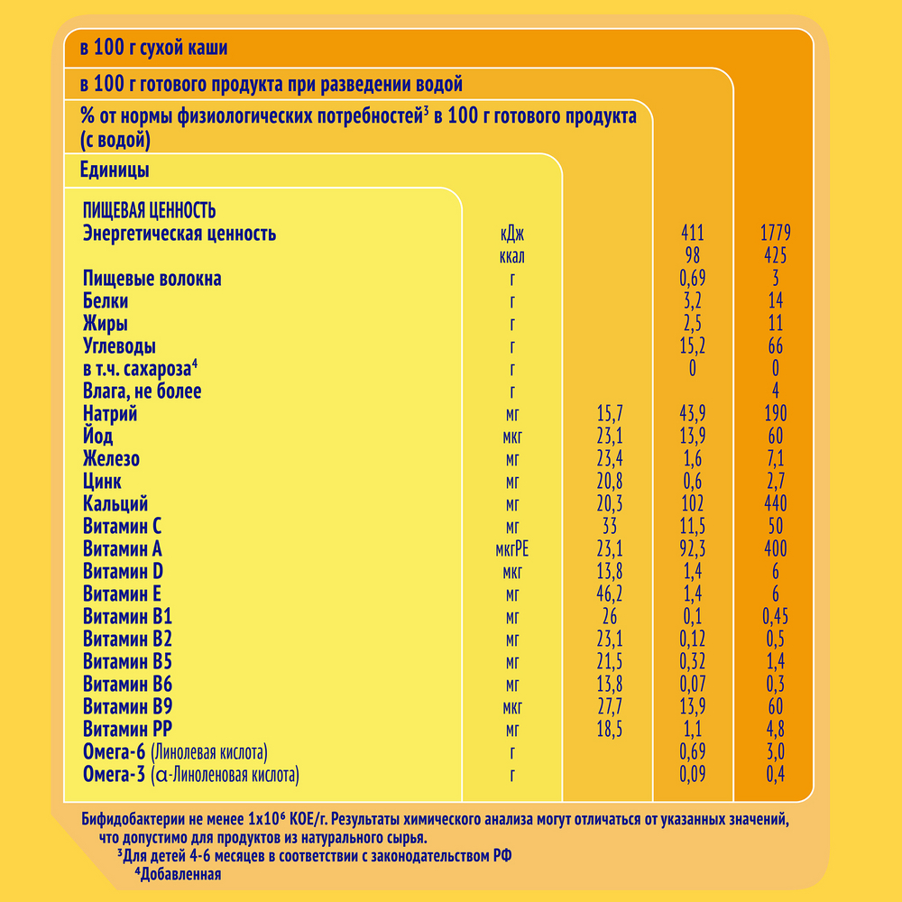 Для здорового роста и полноценного развития подрастающему малышу нужны микронутриенты – витамины и микроэлементы, которые его организм может получить только с пищей. Поэтому врачи-педиатры рекомендуют начинать прикорм с детских каш, богатых витаминами, минералами и пищевыми волокнами. Рецептура детских каш НЕСТЛЕ специально разрабатывалась с учетом главных потребностей растущего детского организмаВашему малышу понравится вкус нежной каши NESTLE, приготовленной по специальной технологии бережного расщепления злаков без консервантов, искусственных красителей и ароматизаторов. С каждой ложечкой каши ребенок получает комплекс микронутриентов (витамины А, С и D, йод, железо, цинк и кальций), необходимых для активного развития и освоения новых навыков. Живые бифидобактерии BL присутствуют в составе каши для детей в концентрации не менее 1х106 КОЕ/г. Благотворное воздействие бифидобактерий на микрофлору кишечника и активизацию иммунных процессов в организме малыша доказано научными исследованиями.Каша Нестле понравится малышам и их животикам. - cодержит бифидобактерии BL, которые способствуют комфортному пищеварению. - содержит комплекс витаминам�� и минеральными веществ Iron+ (Железо+) для роста и развития. -приготовлена по особой технологии бережного расщепления злаков СНЕ (СИ-Эйч-И) для нежной текстуры. При непереносимости лактозы и/или белков коровьего молока кашу необходимо разводить либо водой либо молочной смесью, которую вы используете для вскармливания вашего ребенка.Не варить! Кашу следует готовить непосредственно перед каждым кормлением. Следуйте инструкции на упаковке. Не храните оставшуюся после кормления разведённую кашу.При непереносимости лактозы и/или белков коровьего молока кашу необходимо разводить либо водой либо молочной смесью, которую вы используете для вскармливания вашего ребенка.При разведении водой каша не обеспечивает необходимую пищевую ценность рациона. Проконсультируйтесь с врачом для коррекции рациона.
